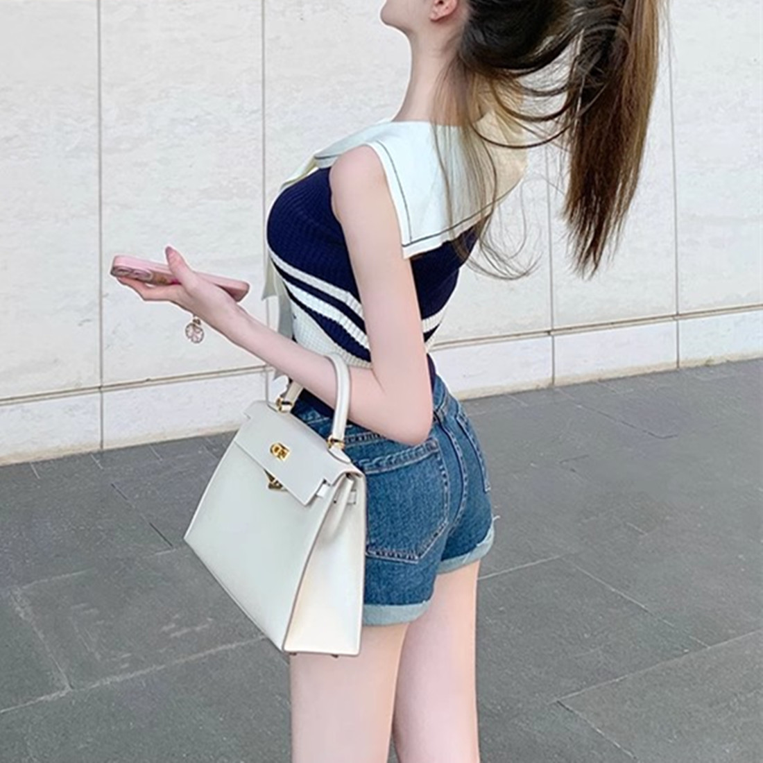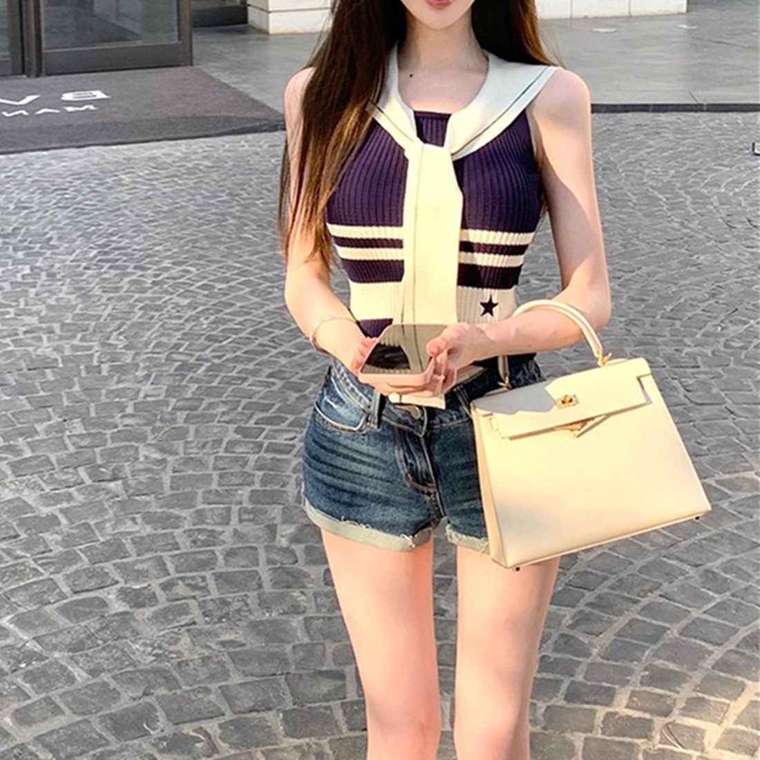 | nameOriginal | Island Holiday Blue and White Striped Navy Collar Ribbon Slim-fit High Waist Vest Knitted Sleeveless Top |