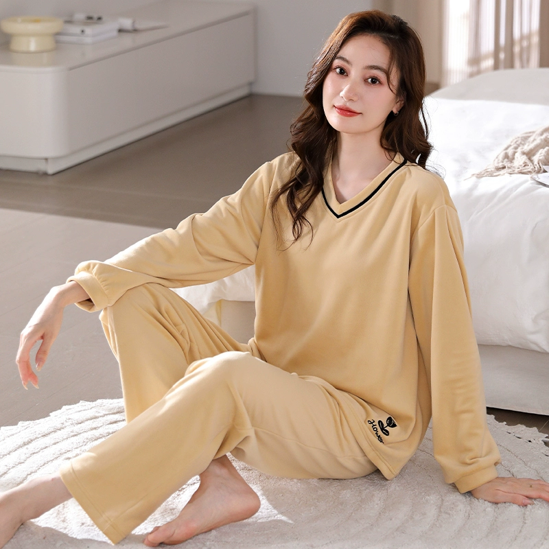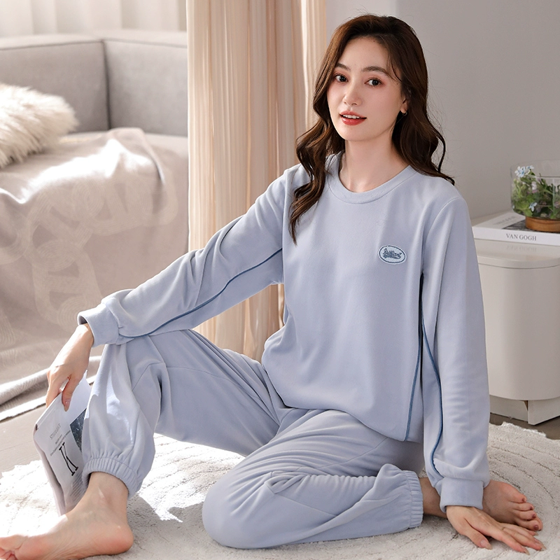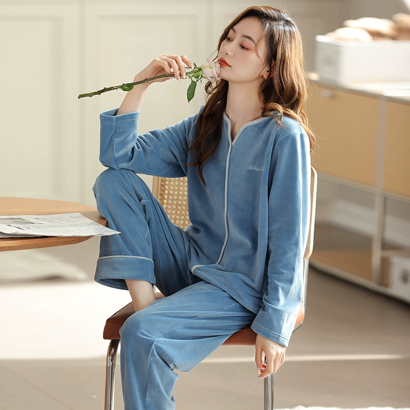 Island velvet pajamas for women in autumn and winter plus velvet thickened long-sleeved simple winter warm anti-static home wear set
