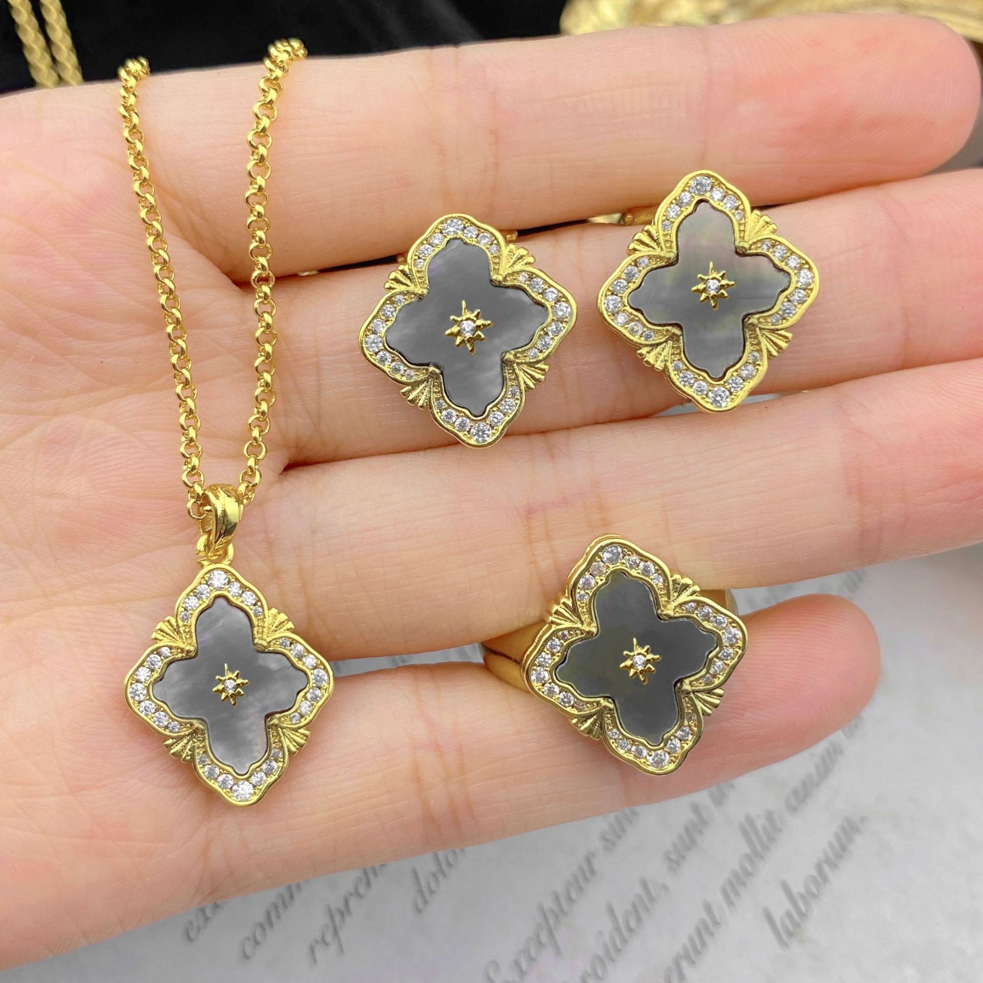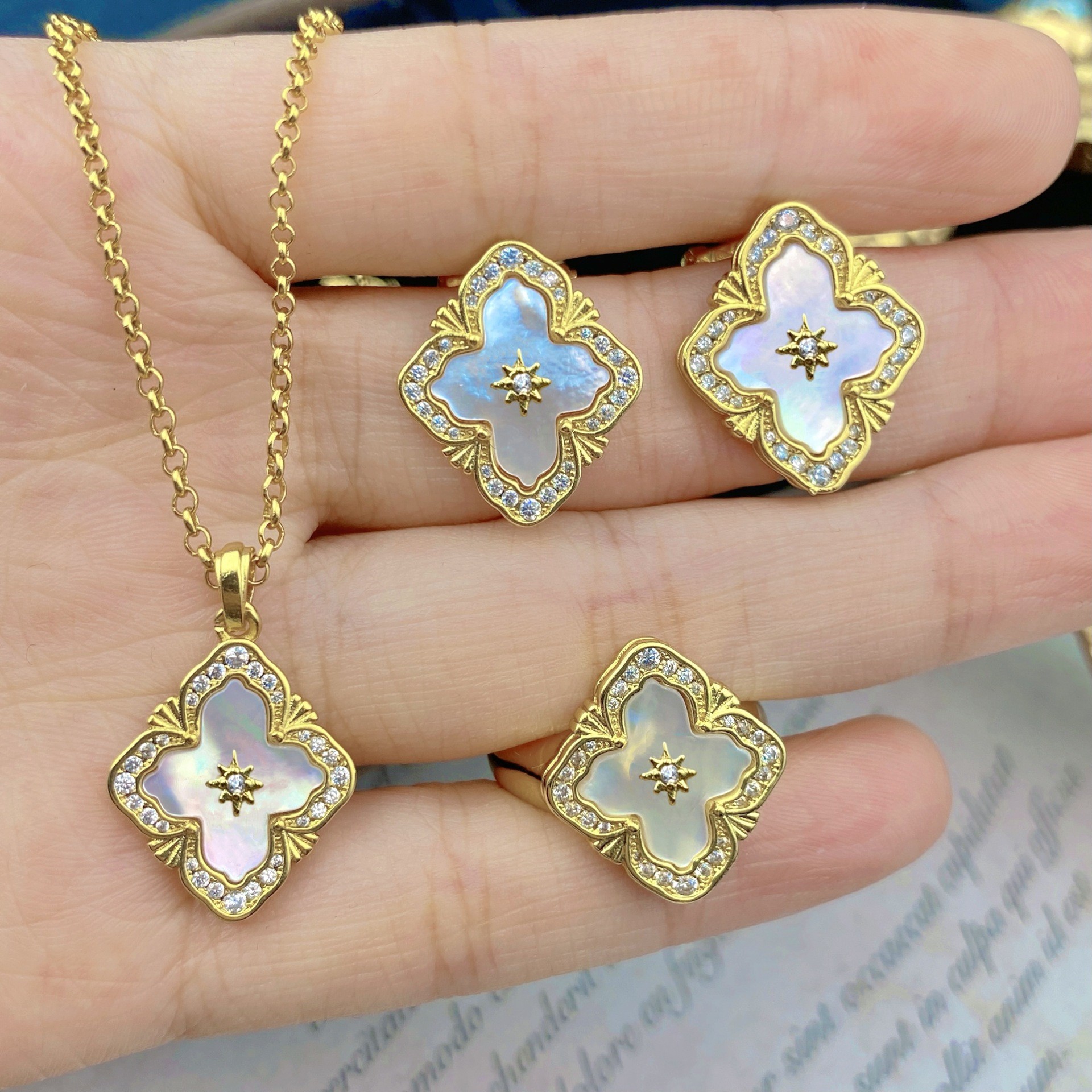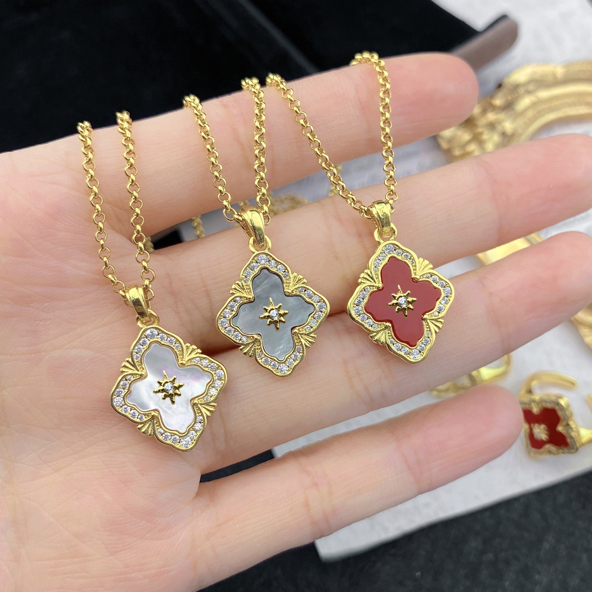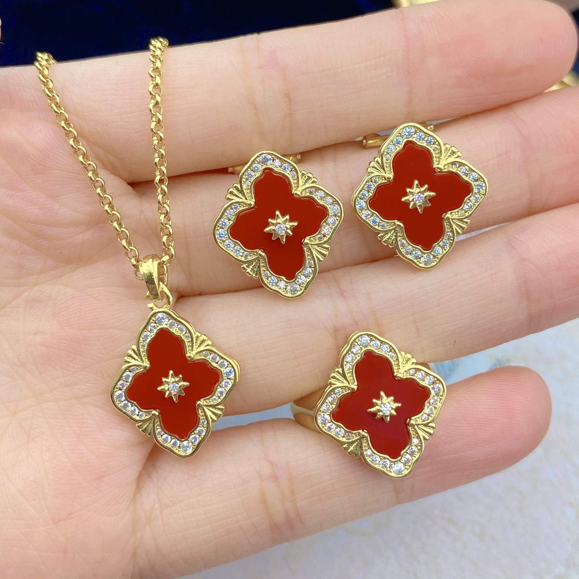 | nameOriginal | Italian Vintage Court Style Blati White Fritillaria suit Four-leaf Clover Bracelet Red Agate Necklace Ring Earrings |