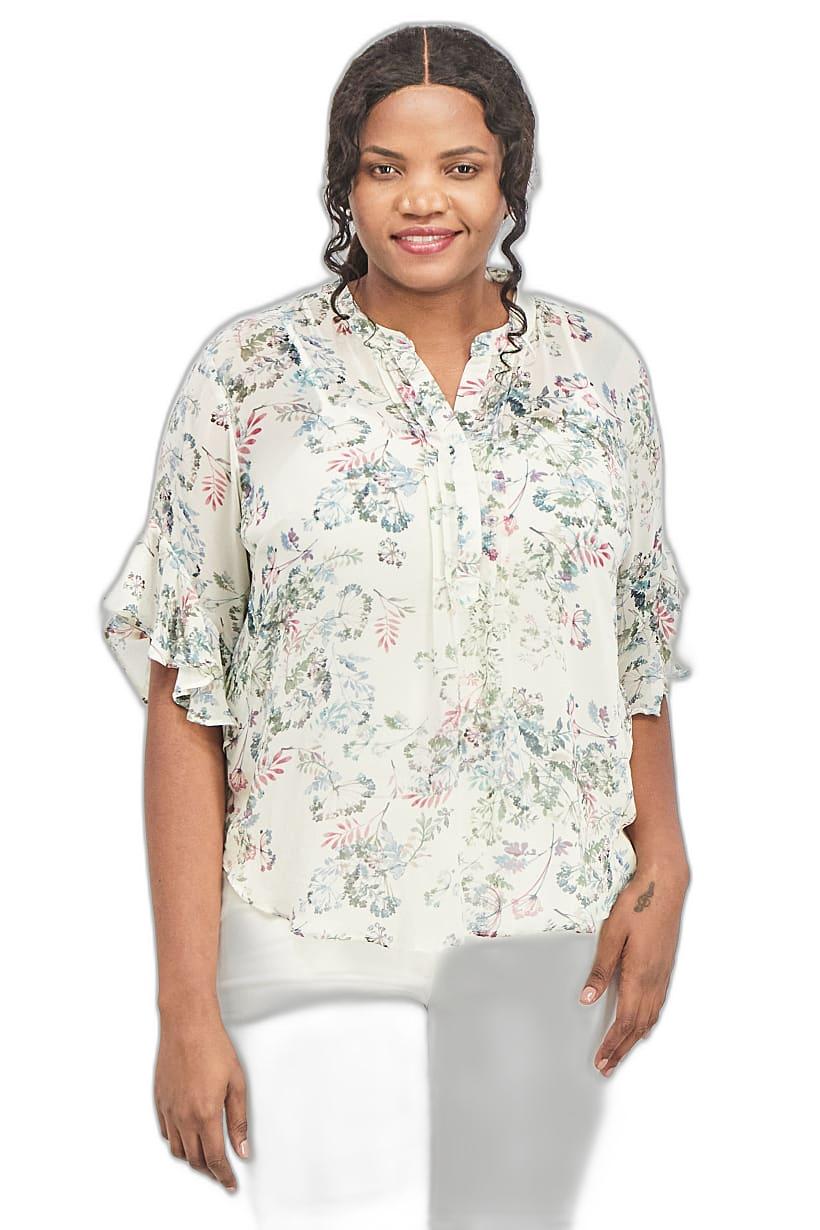 Ivory Combo Floral Print Ruffle Sleeve Top for Plus Size Women with Split Neck.