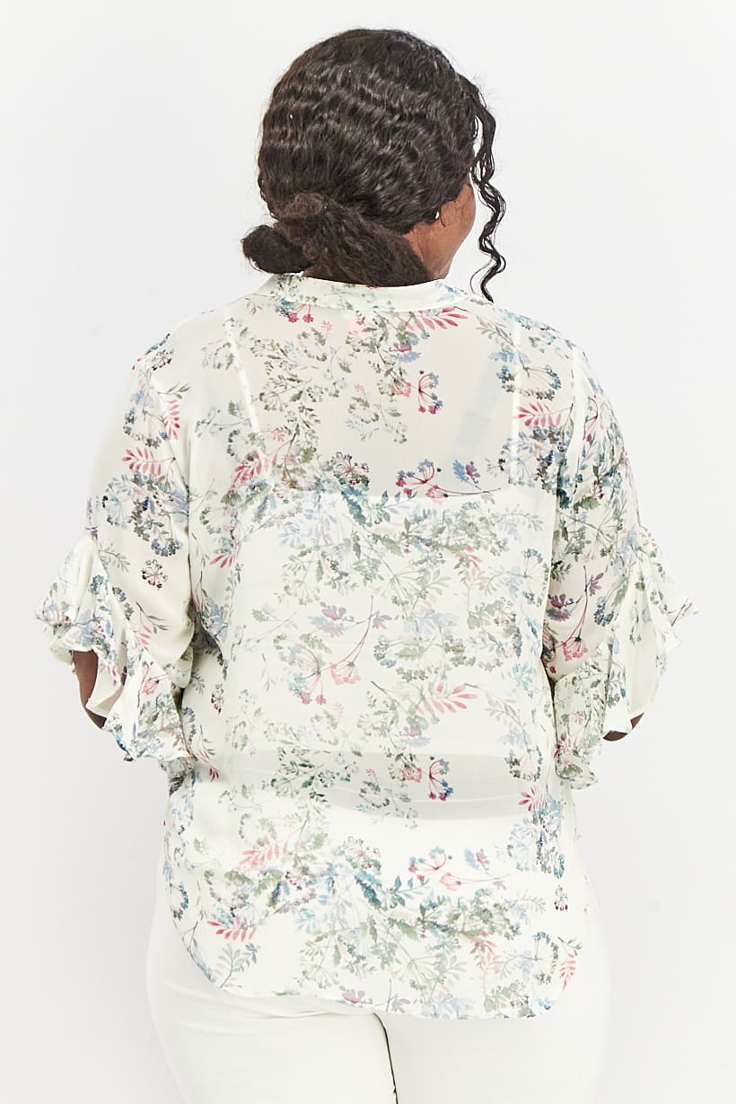 Care : Machine washable, Fit : Plus Size, Size shown : International, Top Style : Blouse, Types of Hem : Straight hem, Types of Neckline & Collar : Split neck, Types of Sleeve : Ruffle sleeve, Disclaimer : Product color may slightly vary due to photographic lighting sources or your monitor settings., Fabrics : 100% Polyester, Occasion : Casual, Pattern & Print : Floral Print, Types of Closures : Button, Color Family : Ivory,