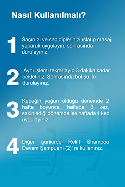 Usage: Apply your hair and hair bottoms by wetting and massaging, then rinse. Repeat the same procedure and leave for 3 minutes. Then rinse with plenty of water. Apply dandruff for 2 weeks, 3 times a week during the period when the dandruff is dense, and 1 time a week during the calming period. Use Relift Shampoo Continuation Shampoo on other days.