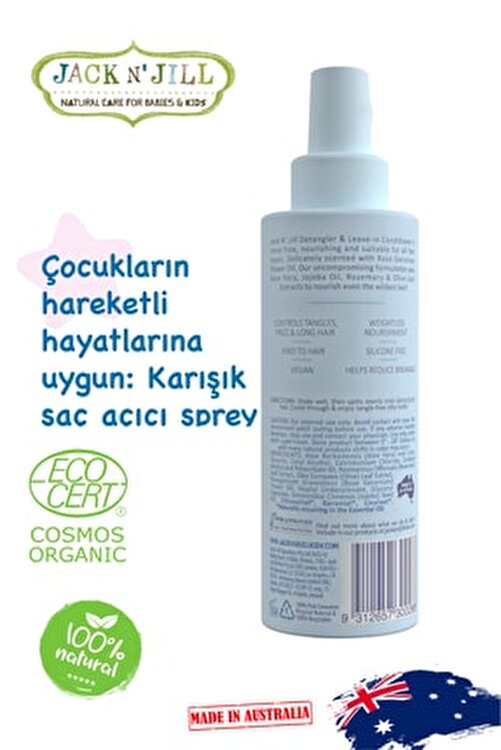 JACK N JILL EASY COMB HAIR OPENER AND CONDITIONER SPRAY 200 ML COMPLETELY NATURAL INGREDIENTS No rinsing required After washing your child’s hair, squeeze the spray and dry it will also open the tangles in the hair and will nourish your hair thanks to the conditioner. Jack N’ Jill Detangling & Non Rinse Conditioner does not require rinsing, nourishing and suitable for all hair types. The rose is delicately fragrant with geranium flower oil. Our uncompromising formula uses Aloe Vera, Jojoba Oil, Rosemary and Olive Leaf Extracts to nourish even the most tangled hair! Jack N’ Jill Angling & Rinse-free Conditioner provides relaxation after bathing for parents and little ones alike! Jack N’ Jill Angling & Rinse Free Conditioner Spray Conditioner Controls tangling, electrification and long hair • Weightless nutrition • Gentle to hair • Silicone-free • Helps reduce breakage • Vegan made in australia…