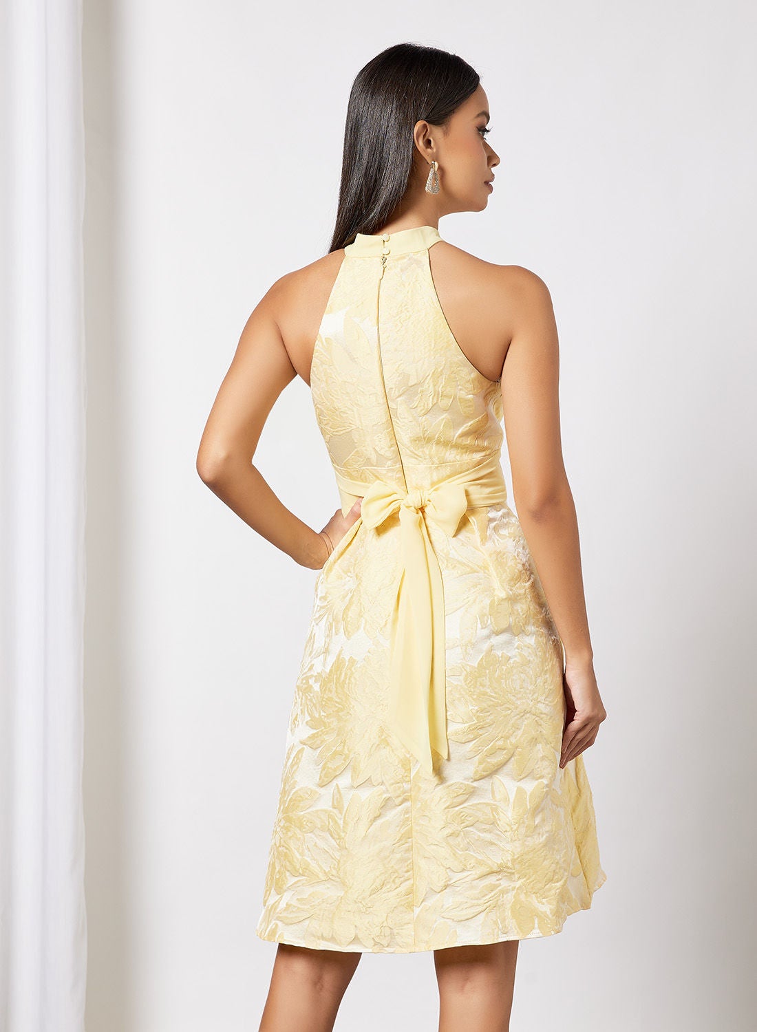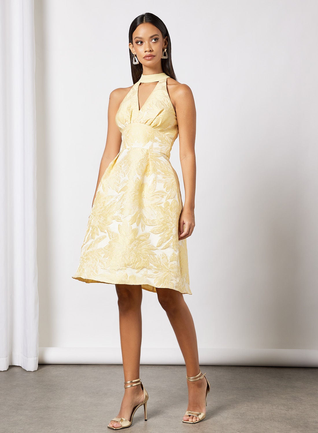 This product features a sturdy and tactile polyester material with a charming floral design throughout. It boasts a high neckline with an open-panel design, as well as an adjustable self-tie waist belt and a concealed zipper closure at the back. The A-line fit falls to knee length, and it is recommended to follow the care label instructions when washing. The model pictured is approximately 178cm tall and is wearing a size 8.
