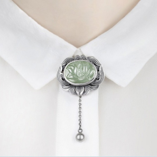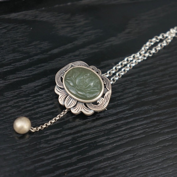 Jade Lotus Natural Jasper Lotus Flower Brooch Plated Sterling Silver Pendant Women’s Tassel Vintage Antique Accessories Pin Cheongsam