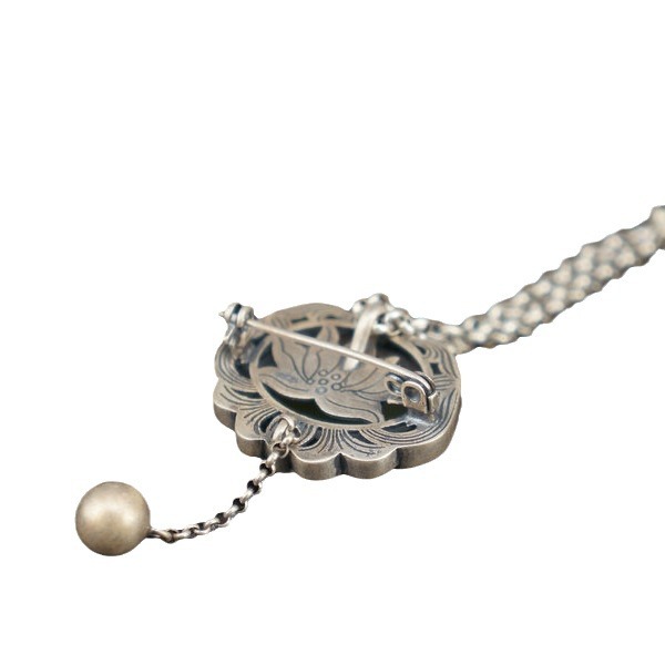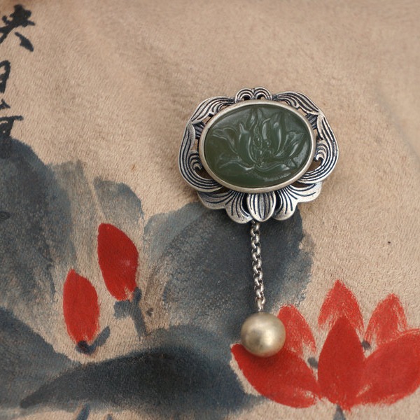 Jade Lotus Natural Jasper Lotus Flower Brooch Plated Sterling Silver Pendant Women's Tassel Vintage Antique Accessories Pin Cheongsam