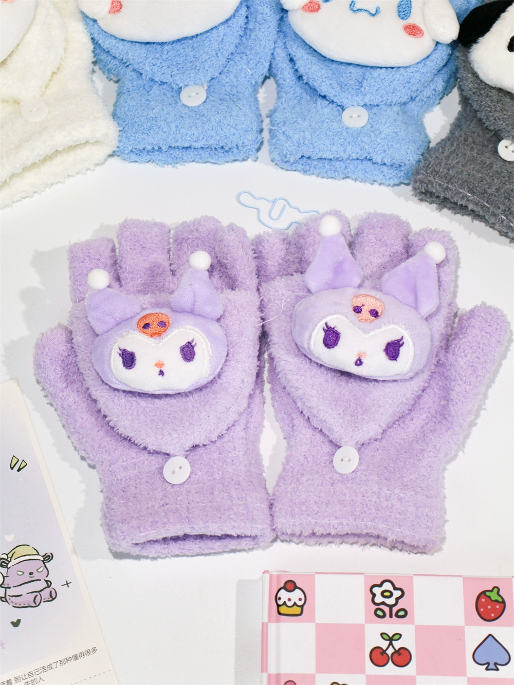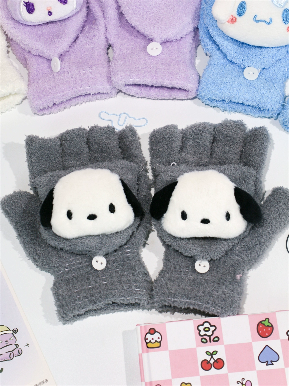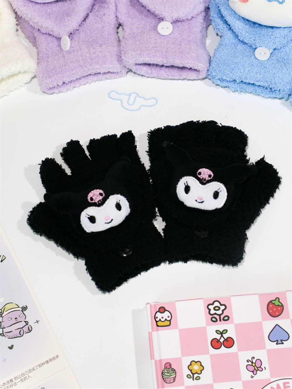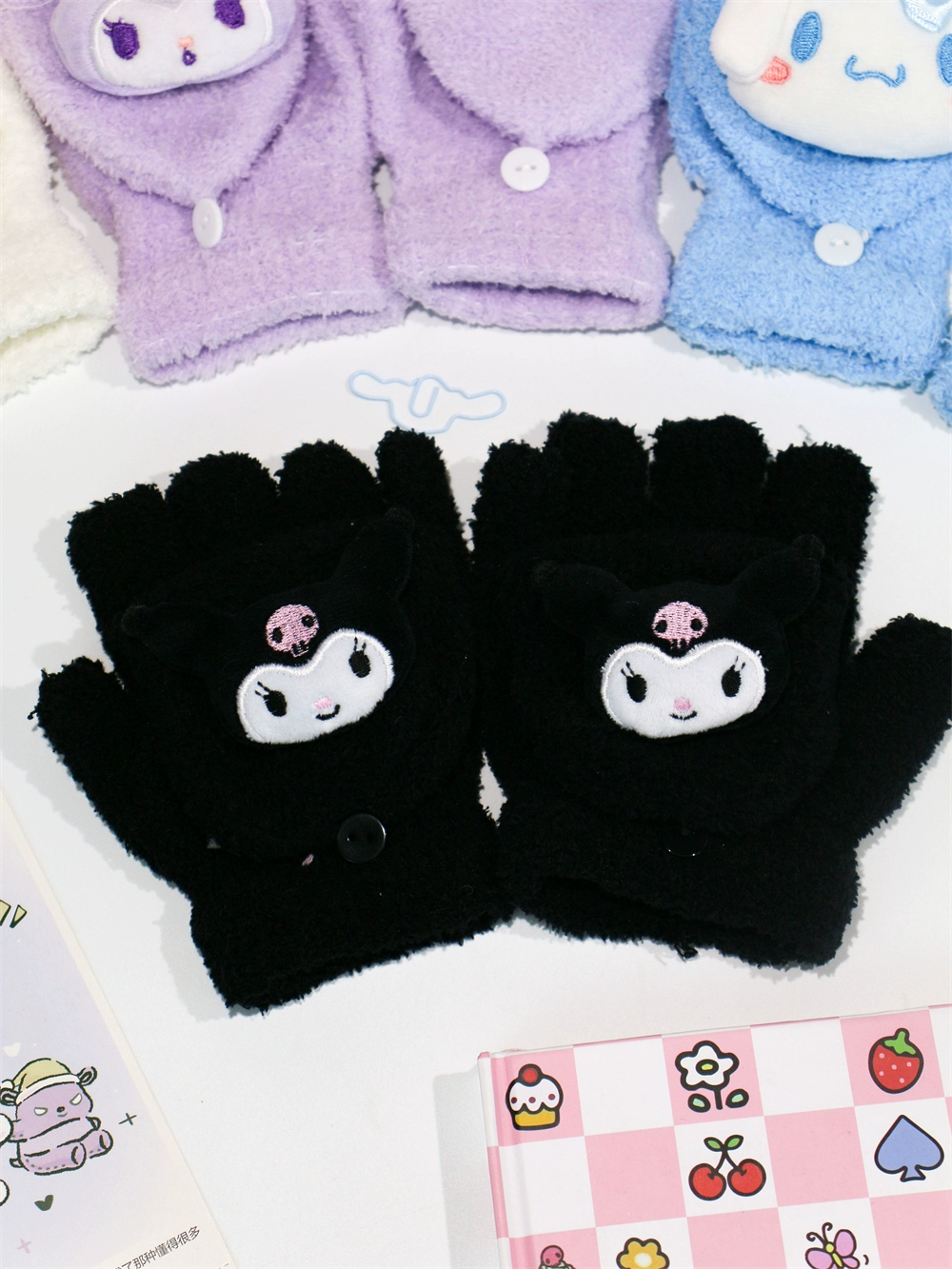 Japanese and Korean flip-top gloves for female students in winter plush and velvet thickened Kuromi cinnamon dog warm dew five-finger hand warmer