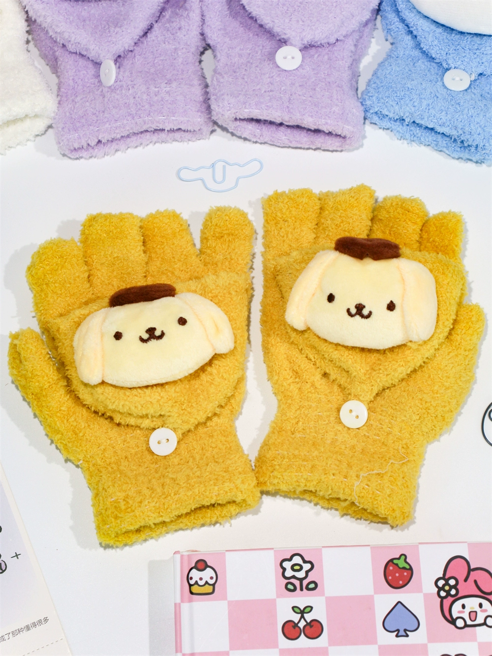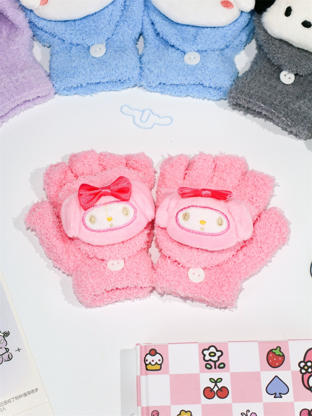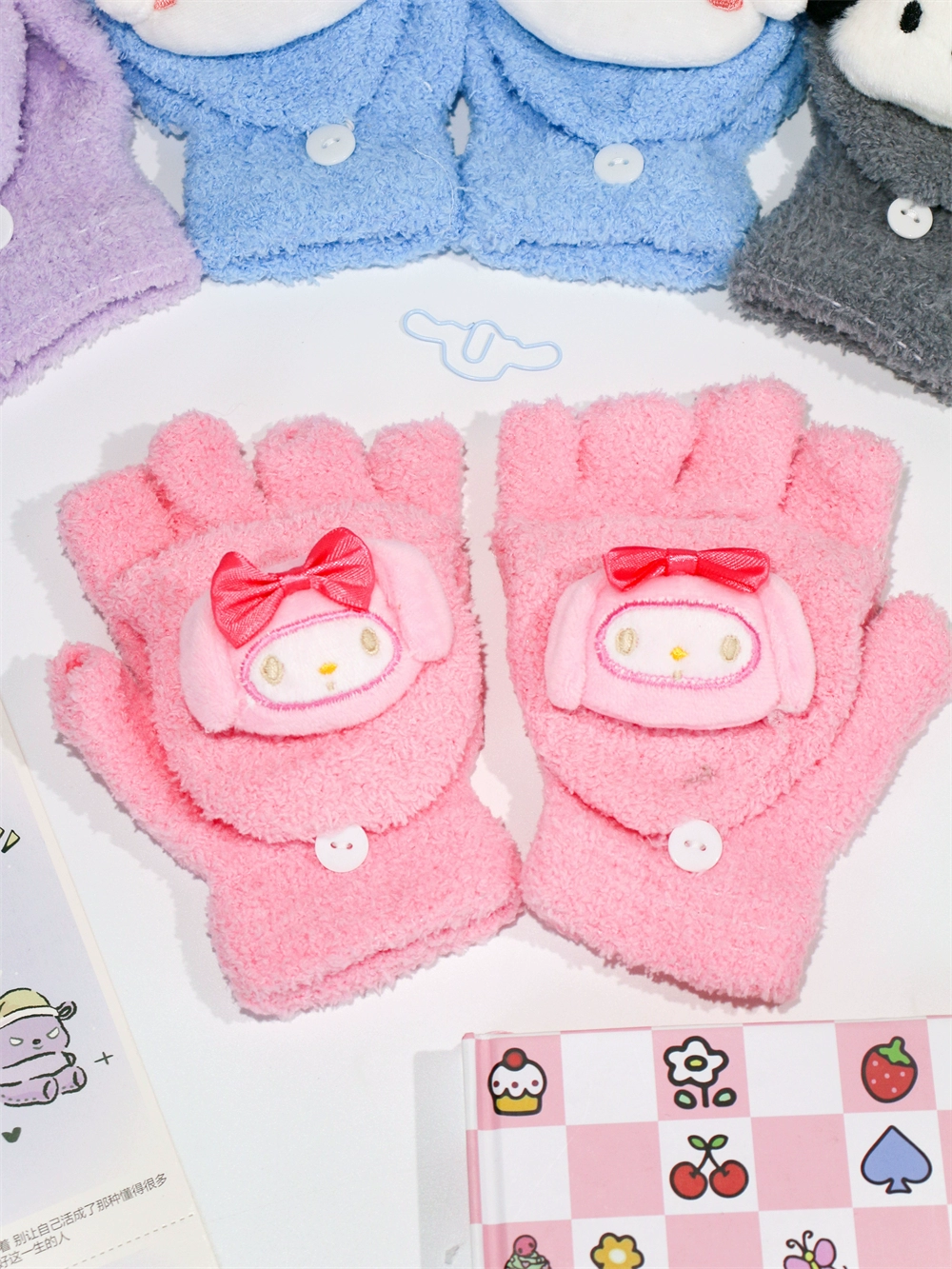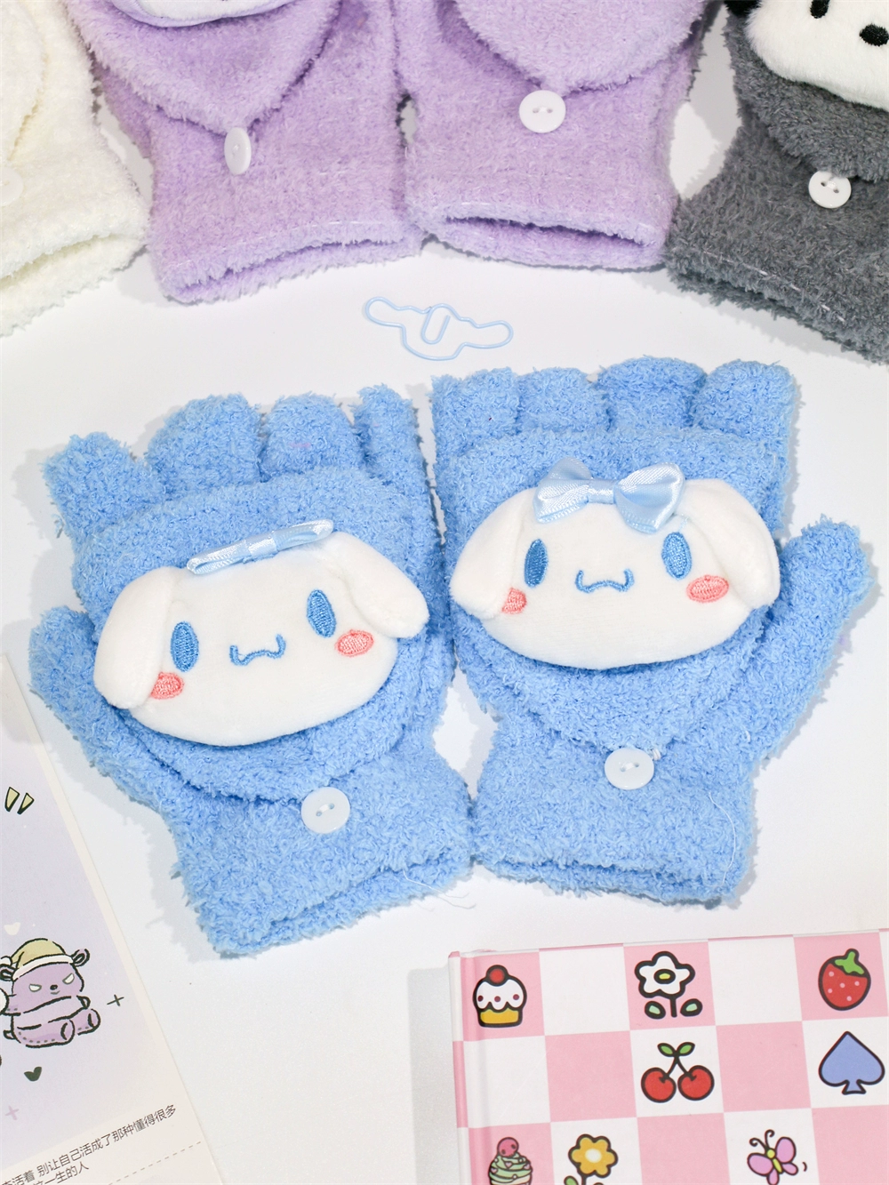 Japanese and Korean flip-top gloves for female students in winter plush and velvet thickened Kuromi cinnamon dog warm dew five-finger hand warmer
