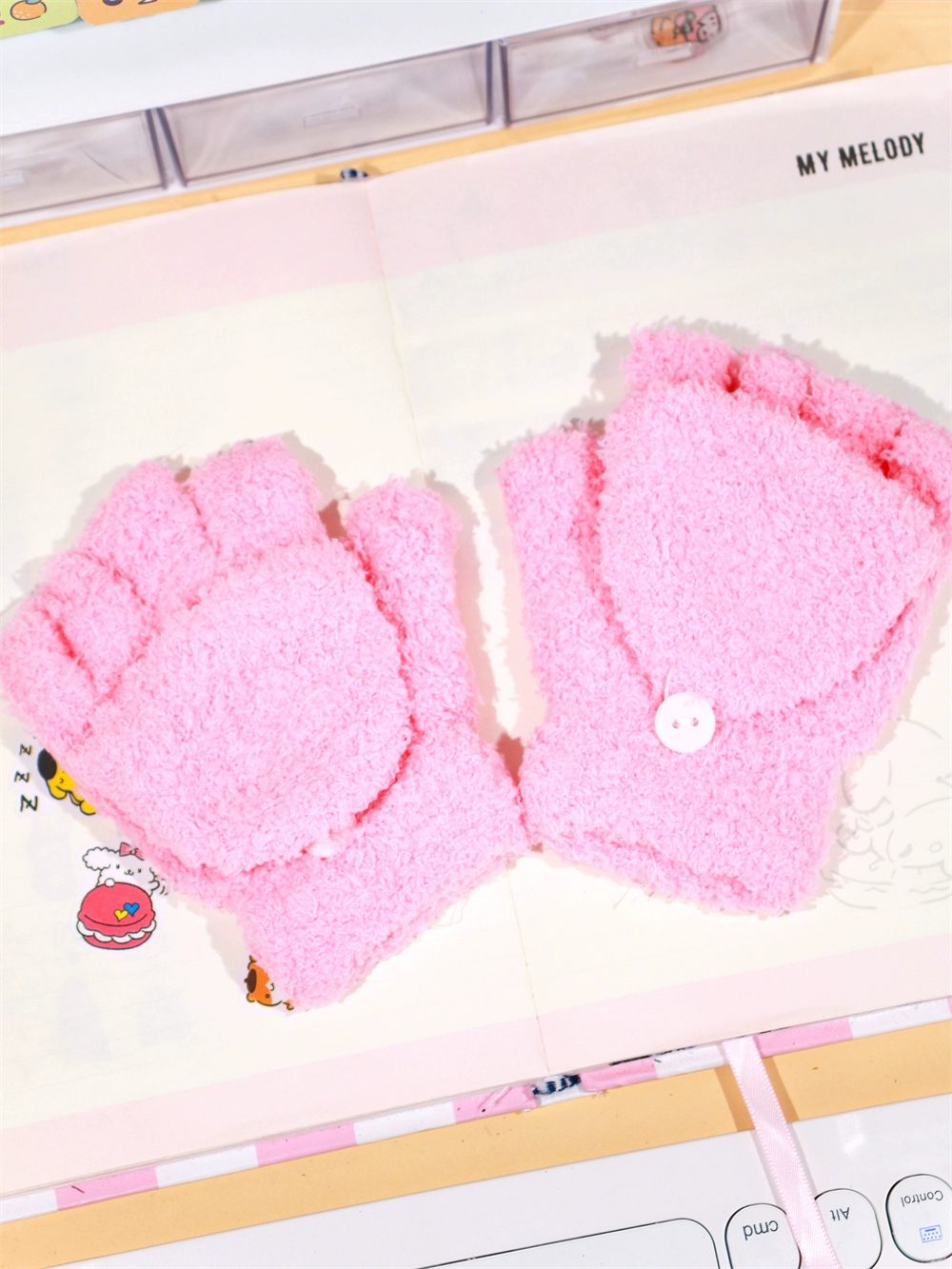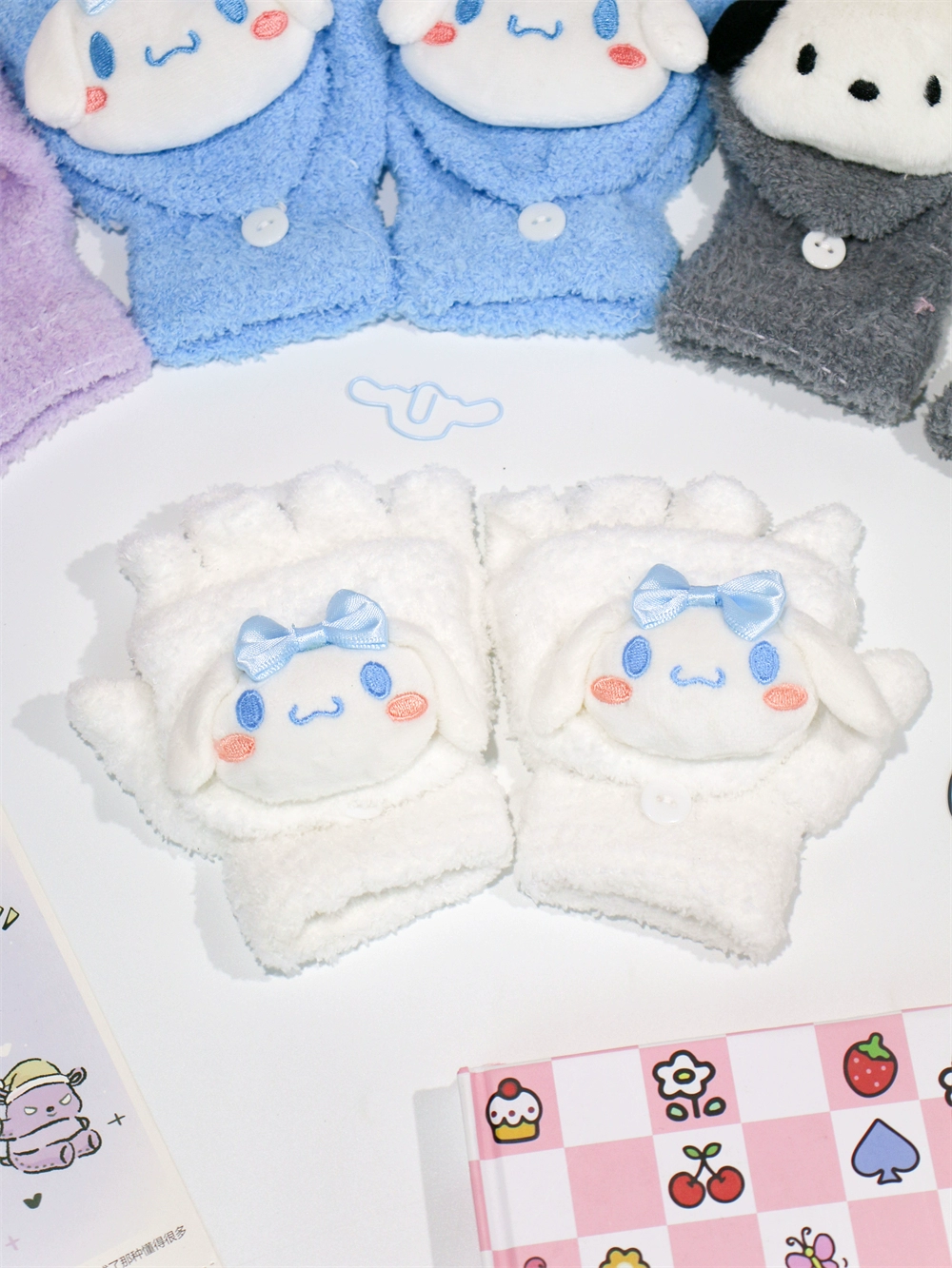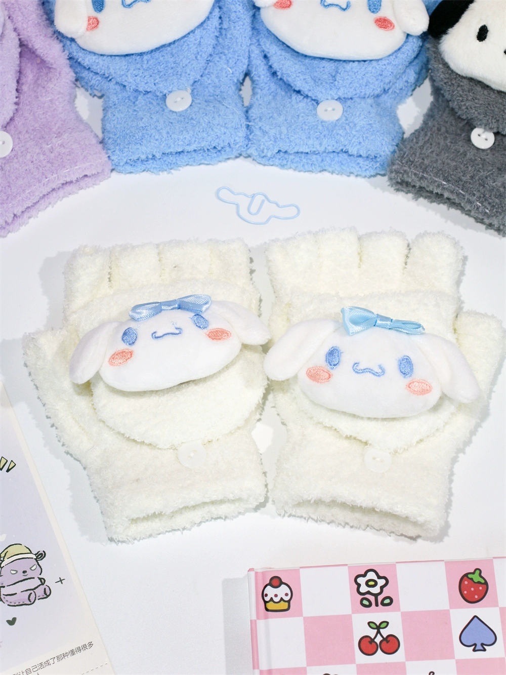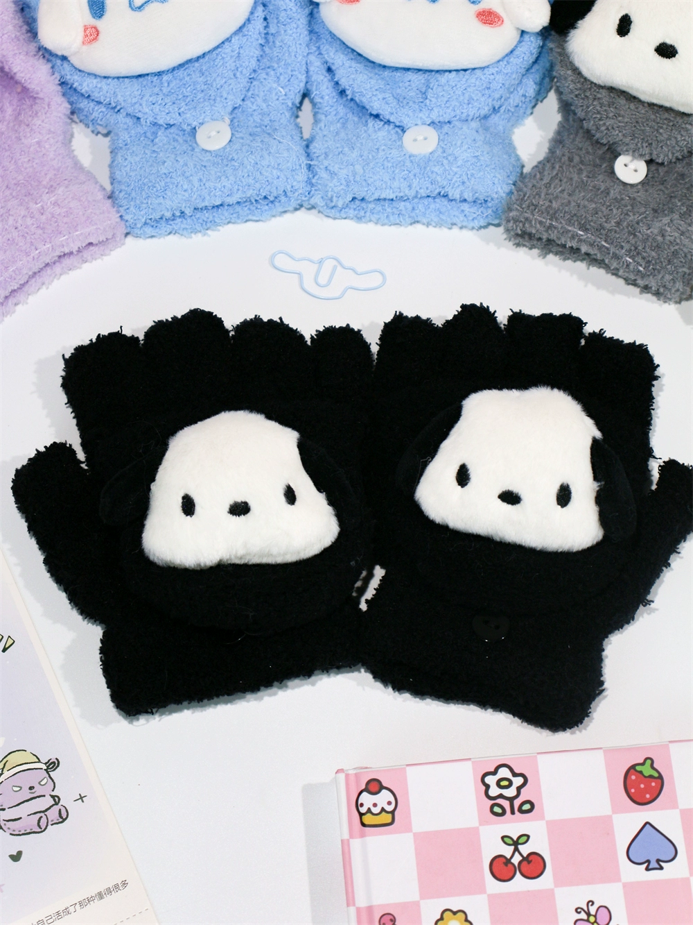 Japanese and Korean flip-top gloves for female students in winter plush and velvet thickened Kuromi cinnamon dog warm dew five-finger hand warmer