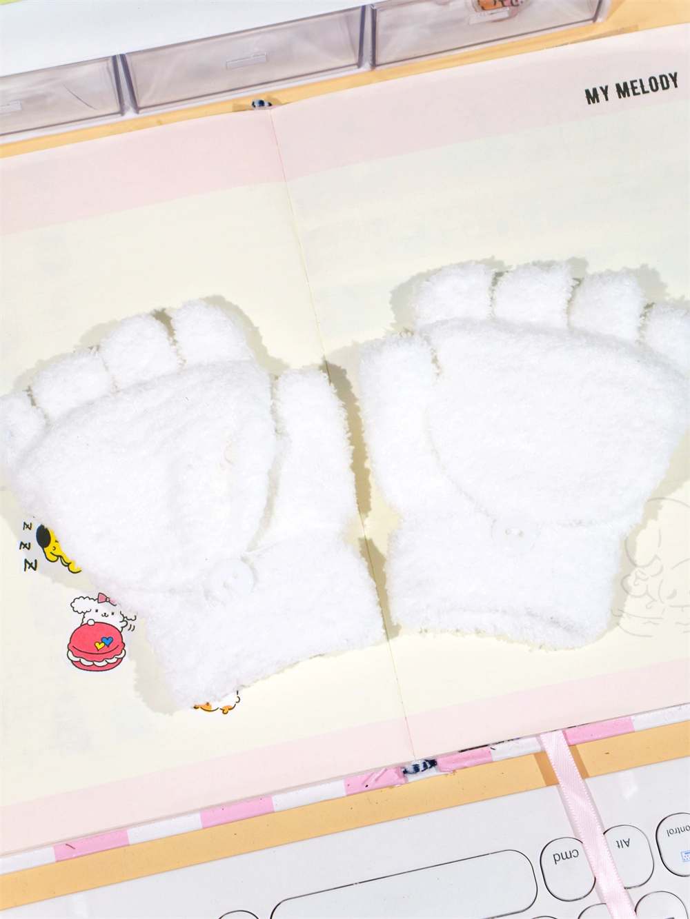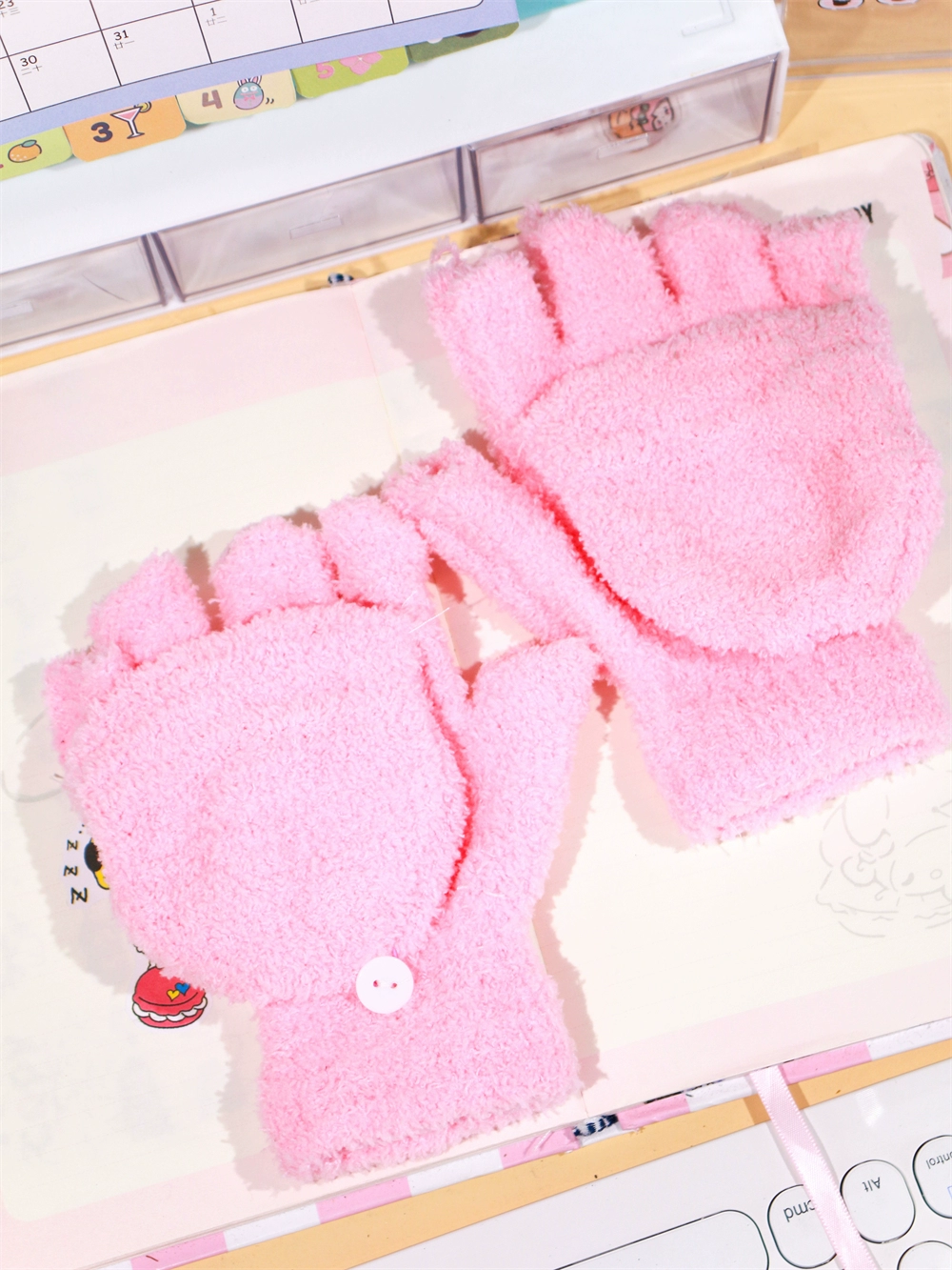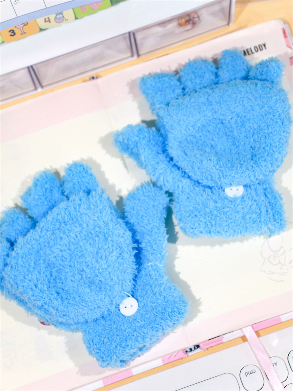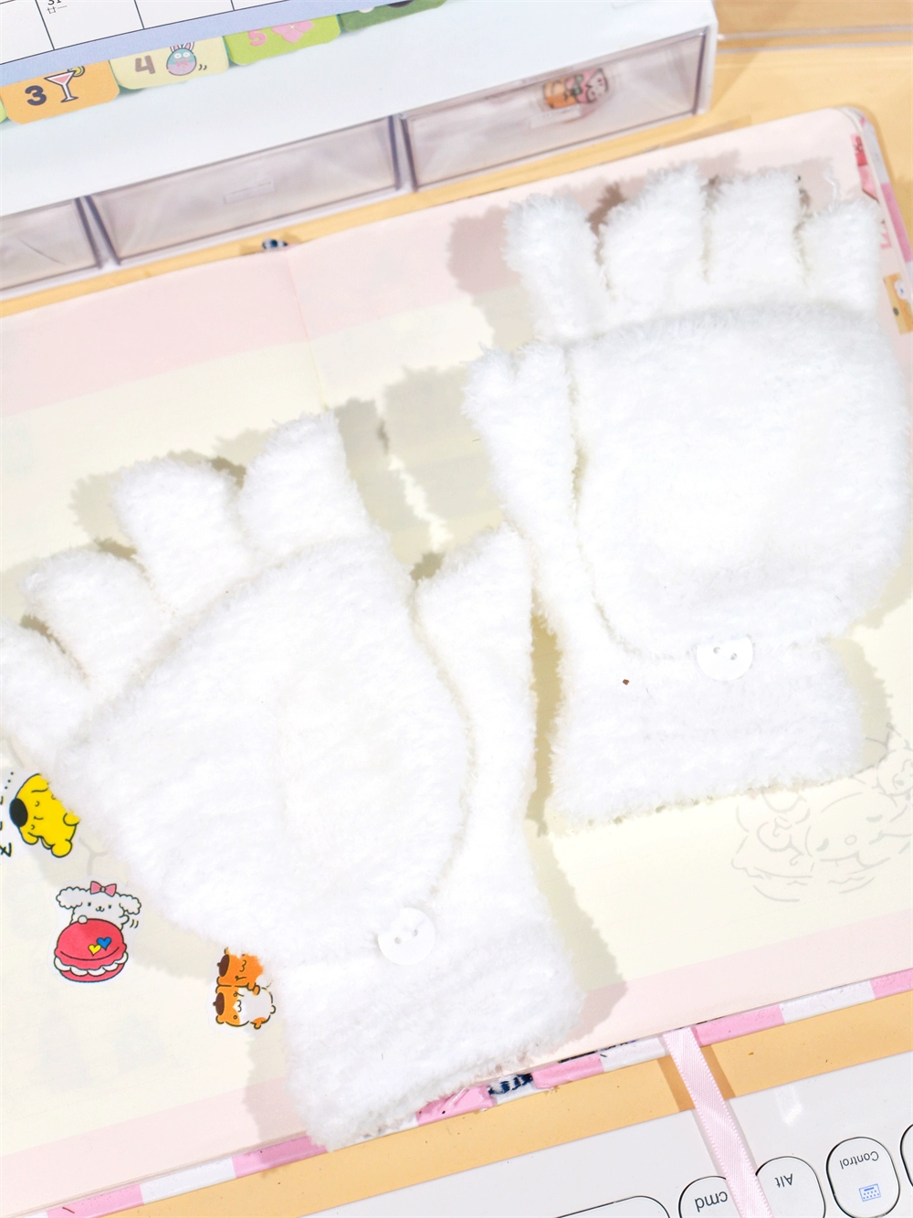 Japanese and Korean flip-top gloves for female students in winter plush and velvet thickened Kuromi cinnamon dog warm dew five-finger hand warmer