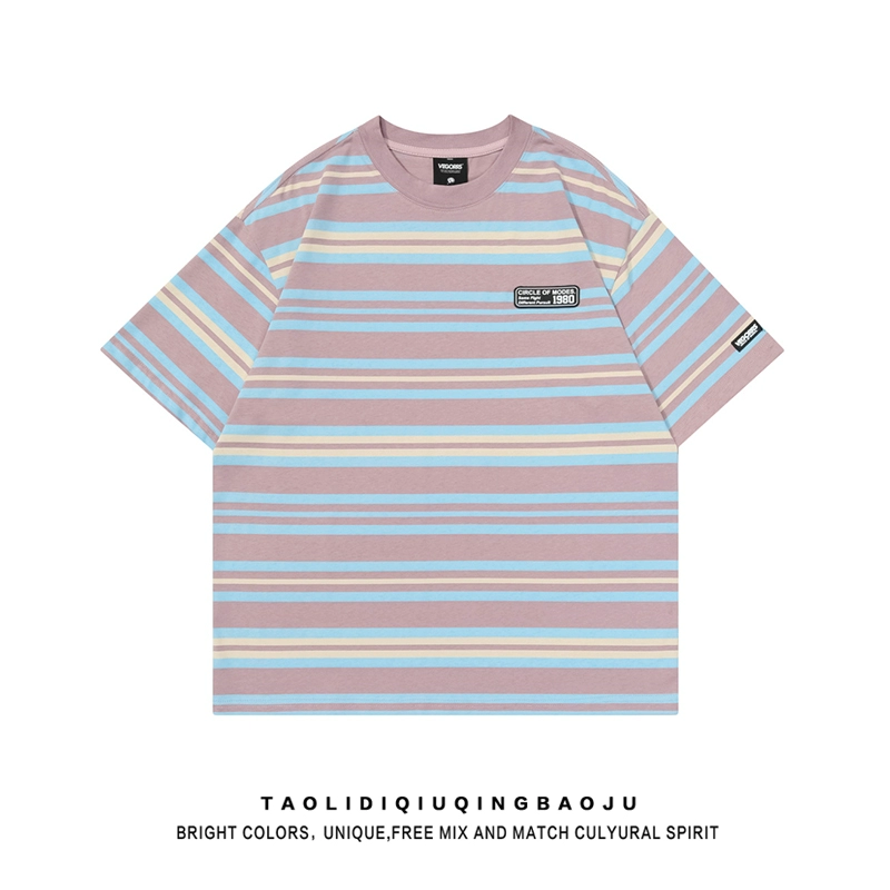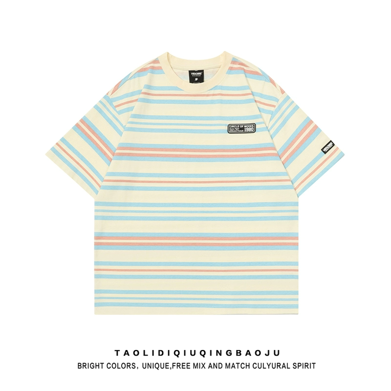Japanese color-blocking retro couple round neck short-sleeved T-shirt