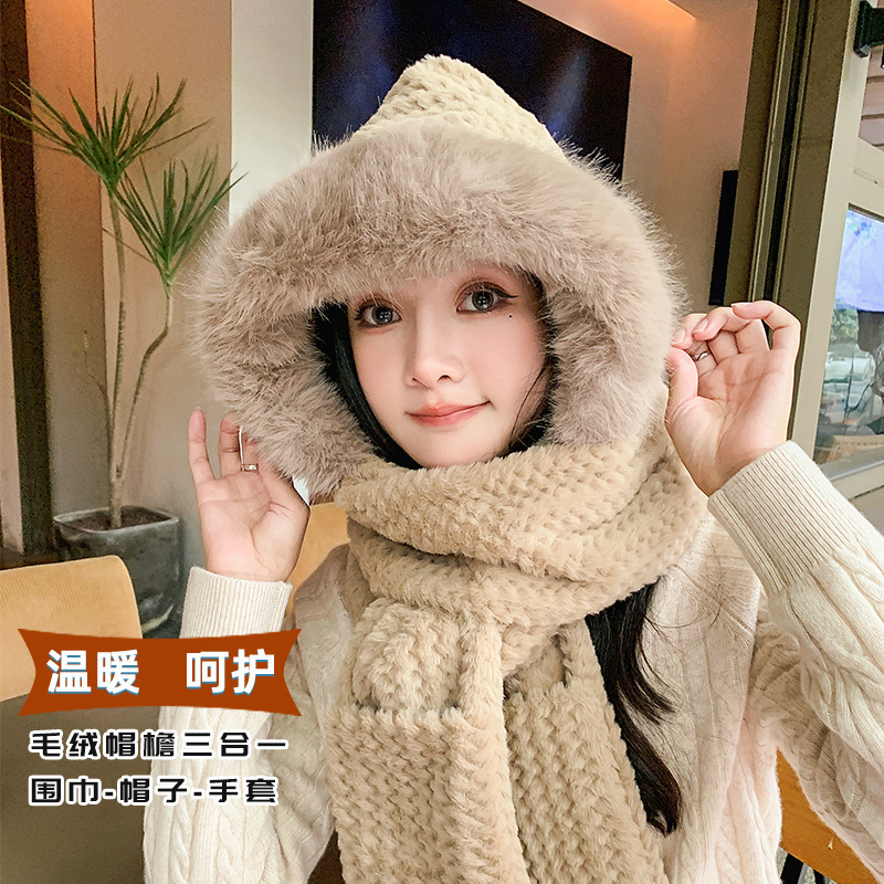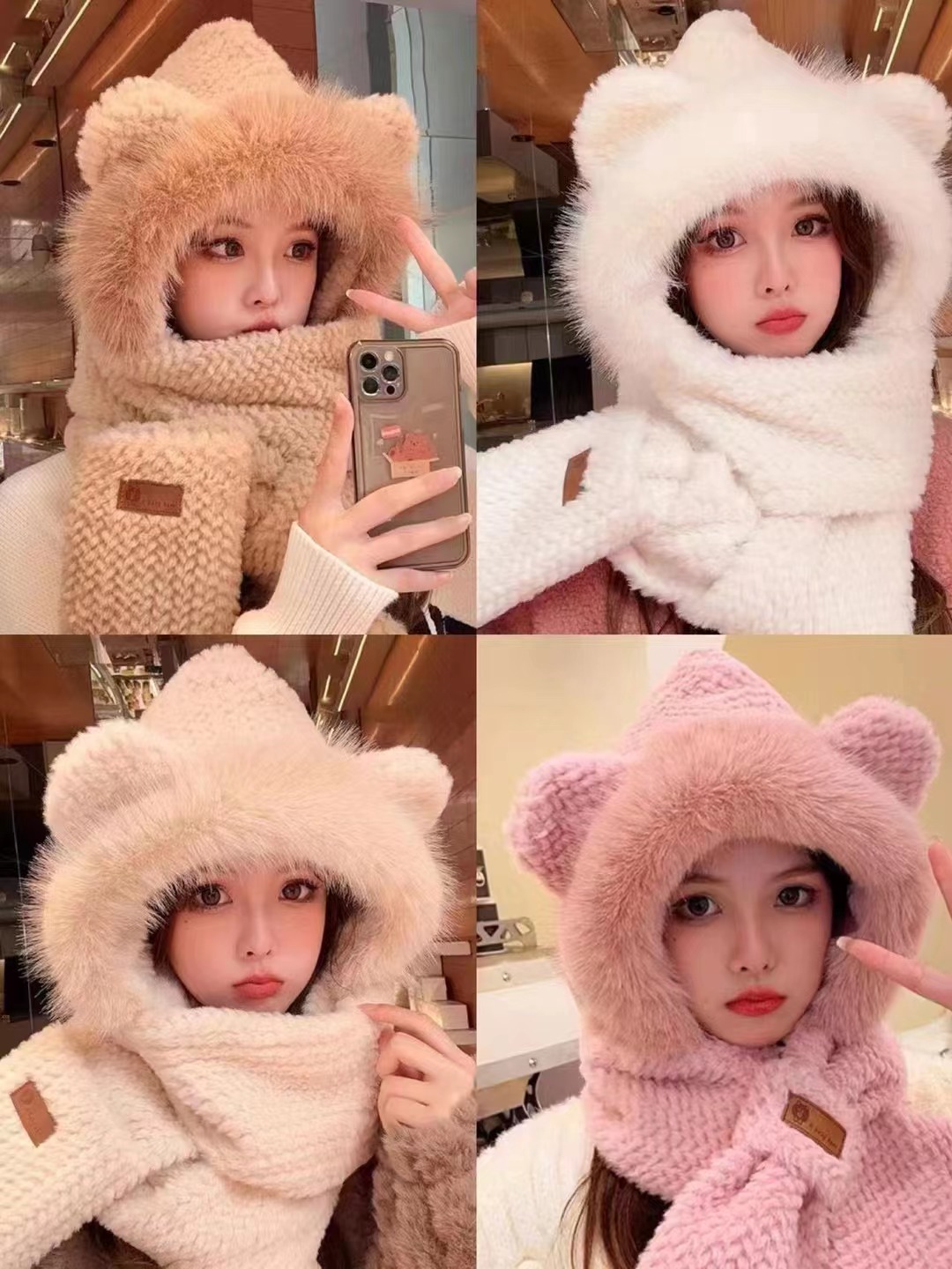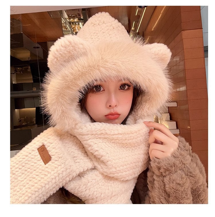 | nameOriginal | Japanese new bear ears plush hat scarf gloves three-piece set women's autumn and winter riding warm plush hat |