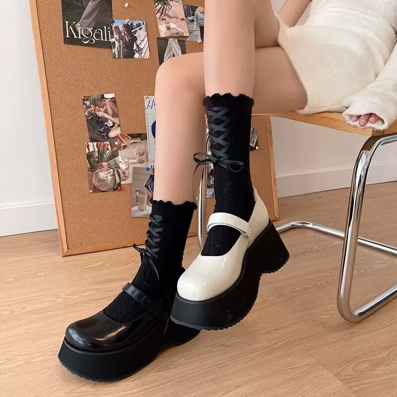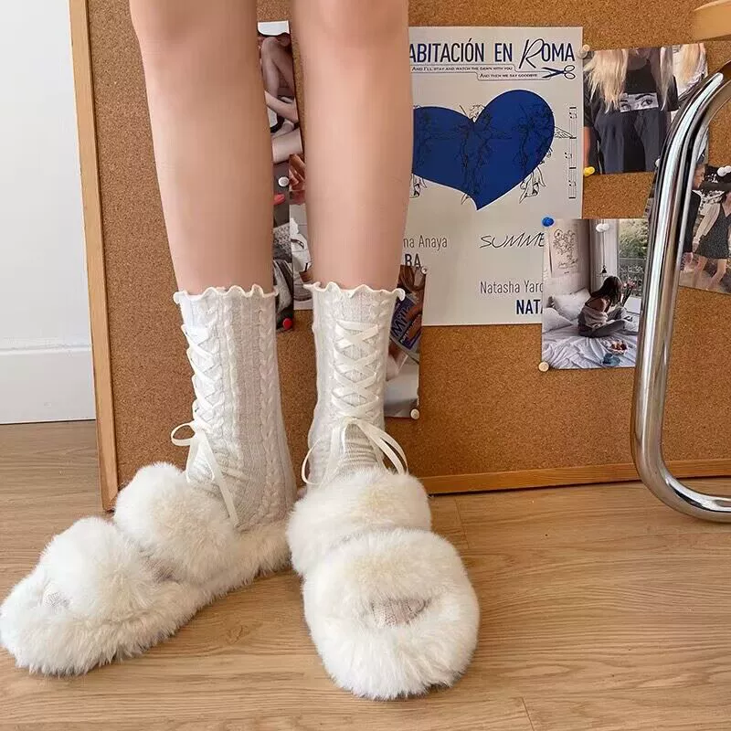 | nameOriginal | Japanese new product millennium hottie y2k twist wool satin bow strap fungus girl pile socks |