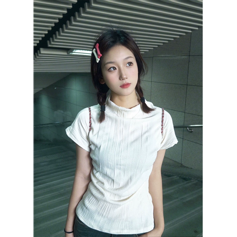 Japanese retro slim pleated thin short-sleeved T-shirt