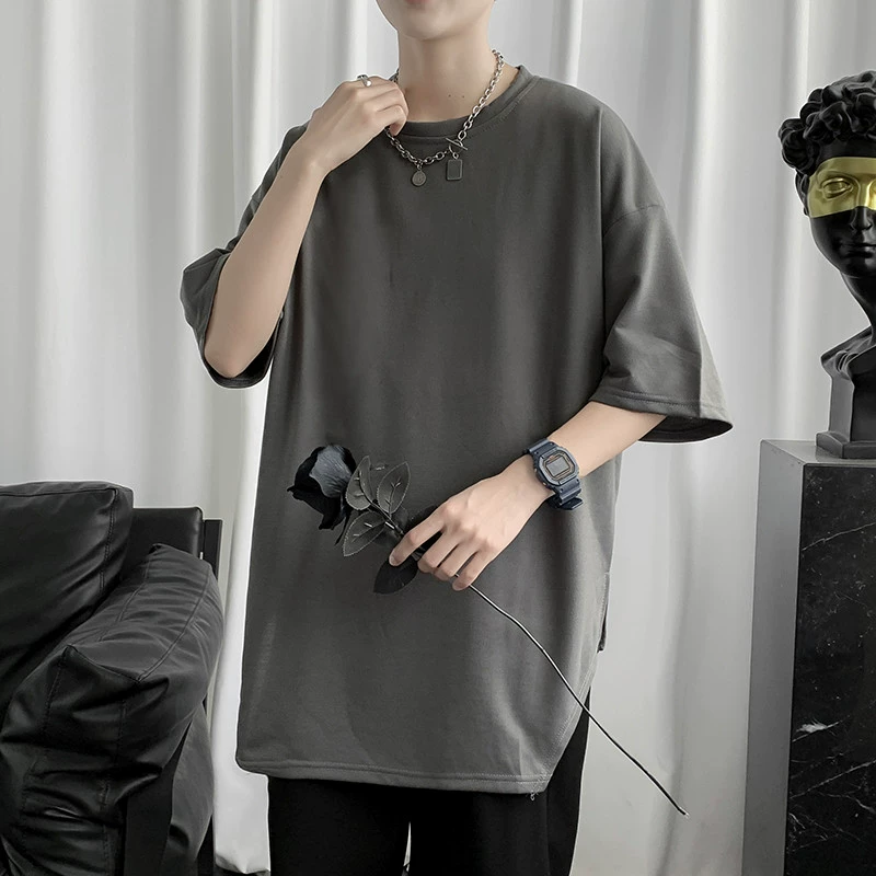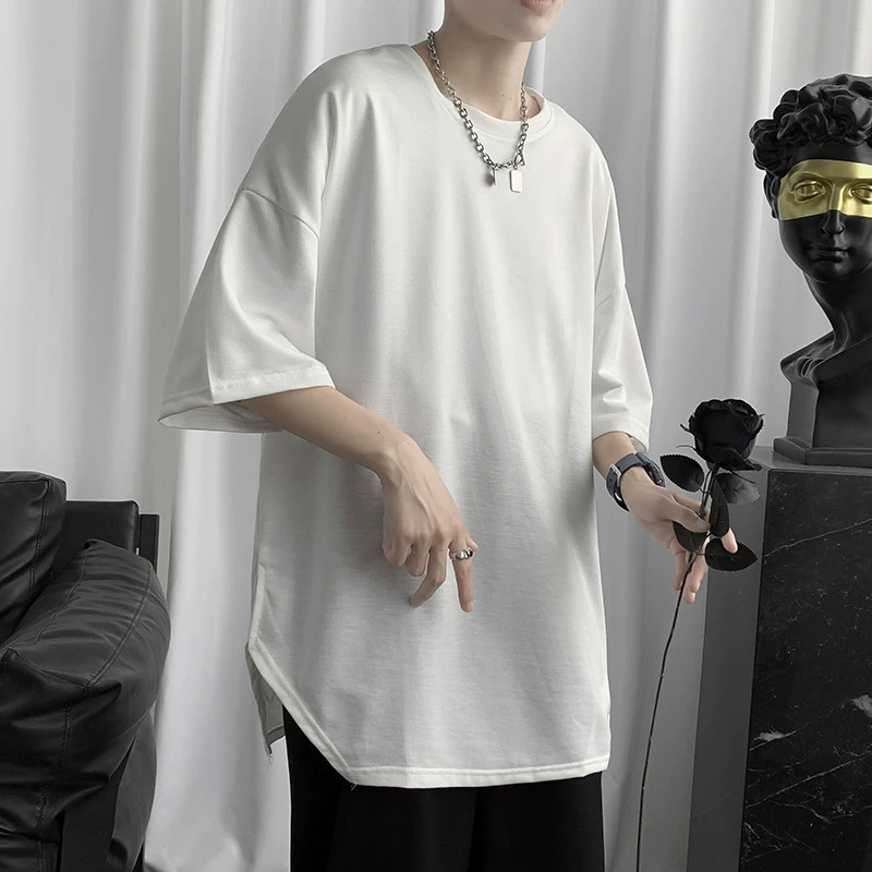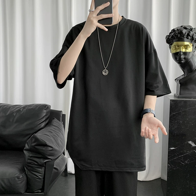 Japanese simple solid color slit round neck pullover short sleeves