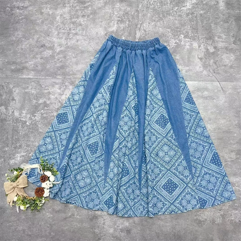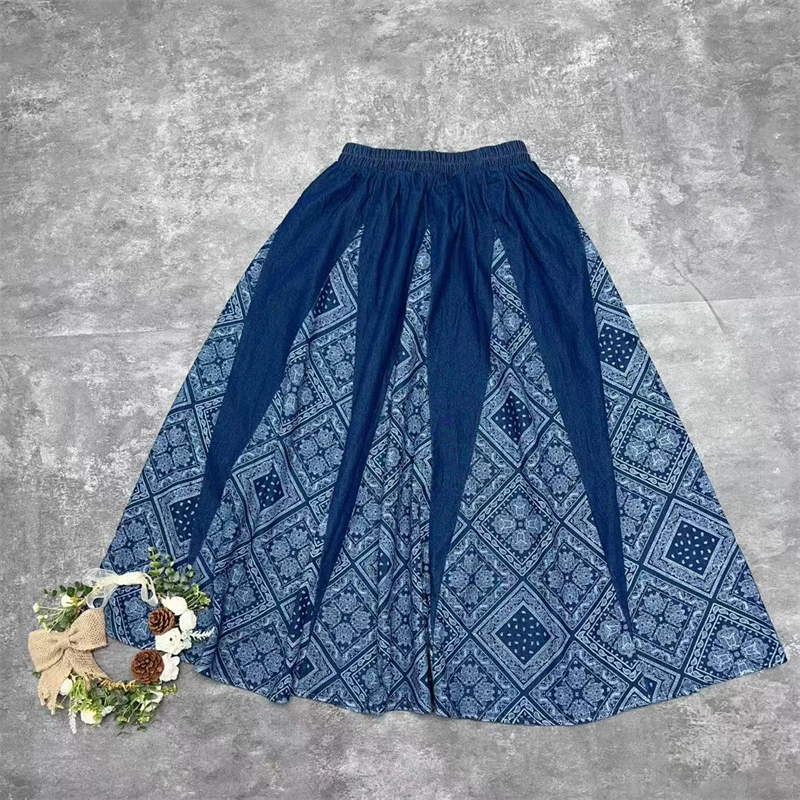 Japanese single contrasting color stitching denim high-waisted skirt women's 2024 summer new sweet elastic waist pure cotton mid-length skirt
