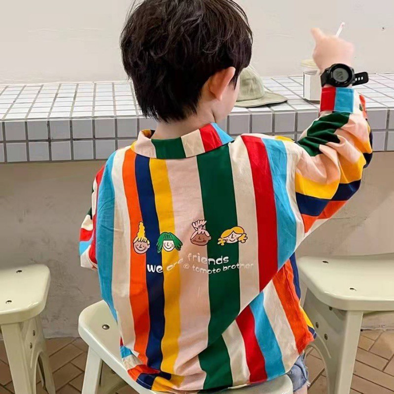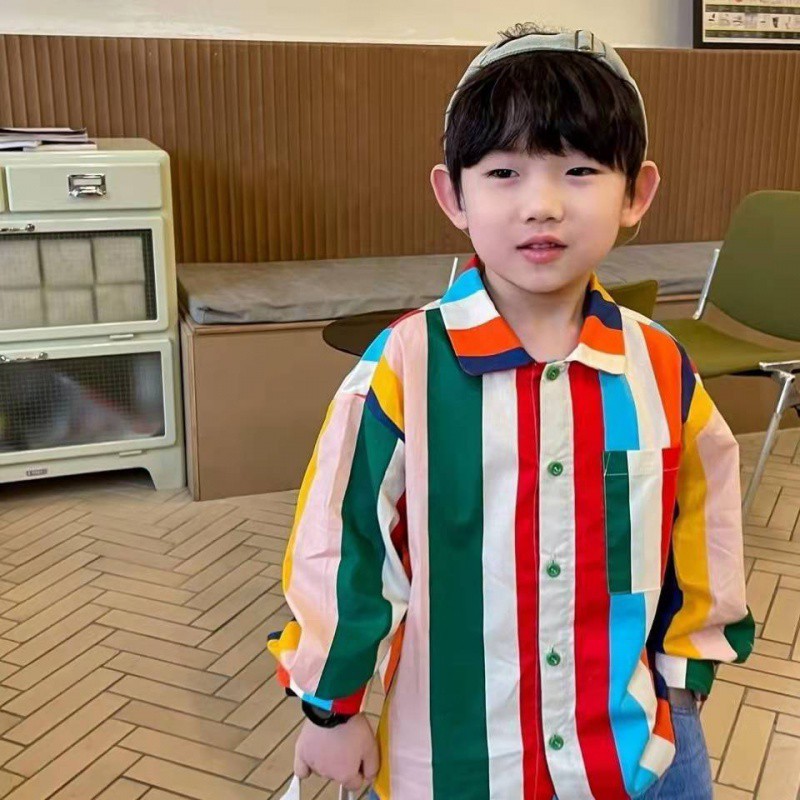 Japanese Style Boys’ Shirt Spring and Summer New Arrival Rainbow Striped Long-Sleeved Shirt Baby Printed Korean Style Fried Street Style for Spring