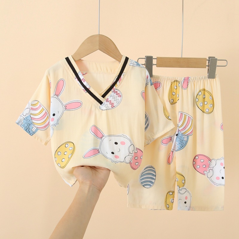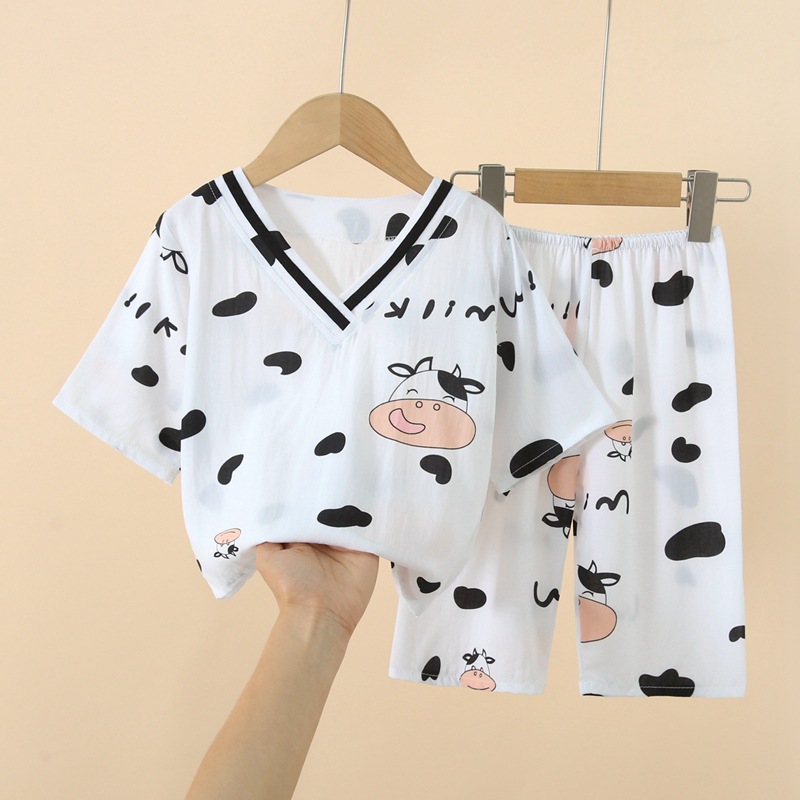 Japanese Style Children's Cotton Silk Seven-point Sleeve Suit Spring and Summer Pajamas for Boys and Girls Artificial Cotton Silk Home Clothes Air-conditioning Clothes