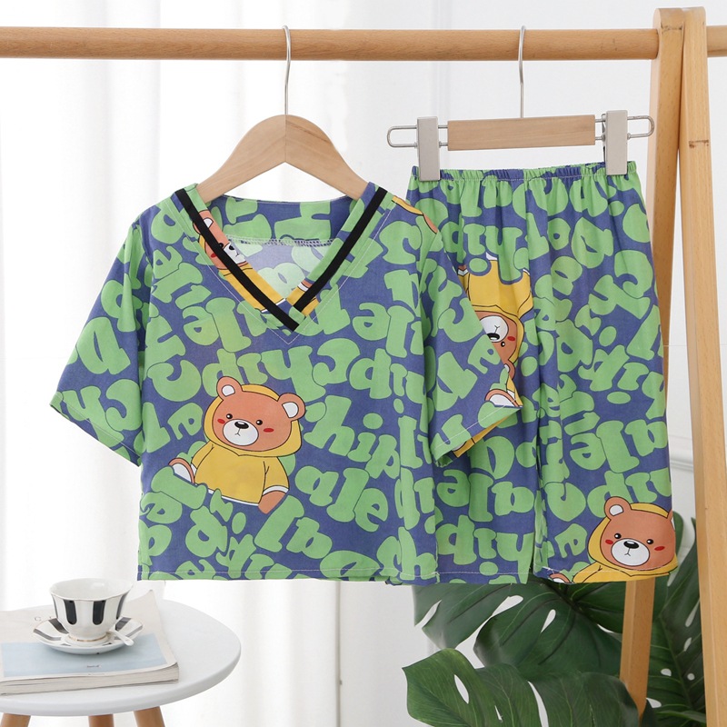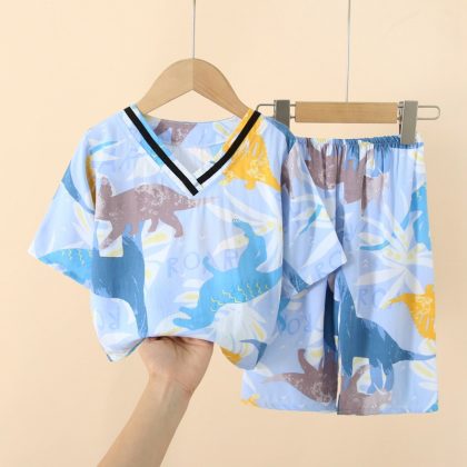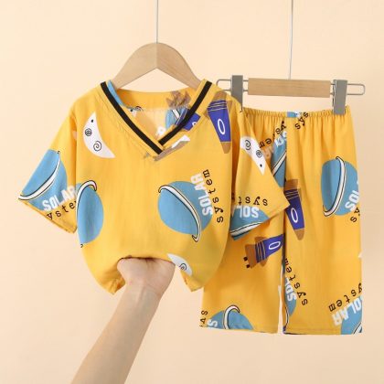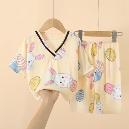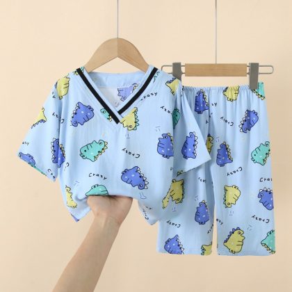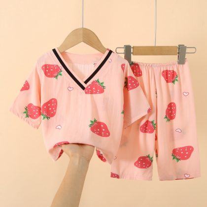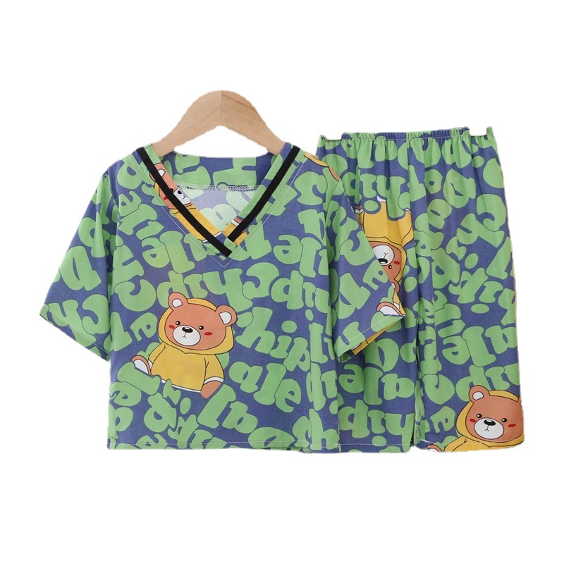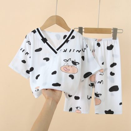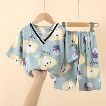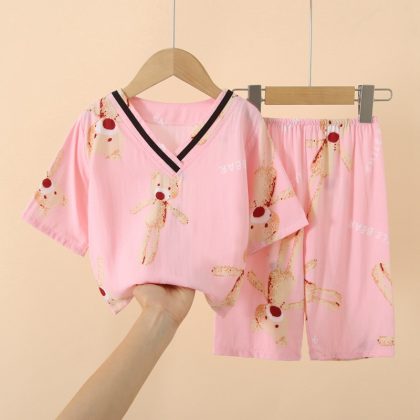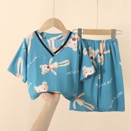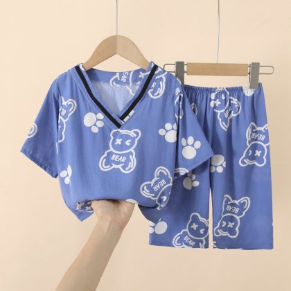 Japanese Style Children’s Cotton Silk Seven-point Sleeve Suit Spring and Summer Pajamas for Boys and Girls Artificial Cotton Silk Home Clothes Air-conditioning Clothes