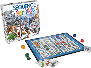 | descriptionOriginal | Description It's the classic game of SEQUENCE made just for kids! Play an animal card from your hand, and place your chip on the corresponding animal on the board. Wild cards add excitement to the game – use a unicorn card to place your chip anywhere, or use a dragon card to remove an opponent's chip. The first player with four chips in a row wins! This exciting strategy game helps develop logical thinking skills. Reading is not required to play. Targets kids ages 3-6 and is for 2-4 players. |