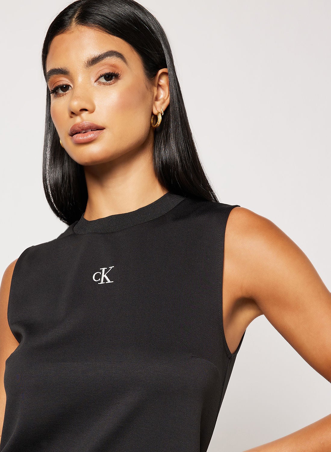 This product features a crew neckline and short sleeves made from high-quality Punto Milano jersey fabric. It also includes convenient dual side slip-in pockets. To ensure proper care, please follow the instructions on the care label. The Calvin Klein signature branding adds a touch of style to this piece. The model pictured is approximately 177cm tall and is wearing a size S.
