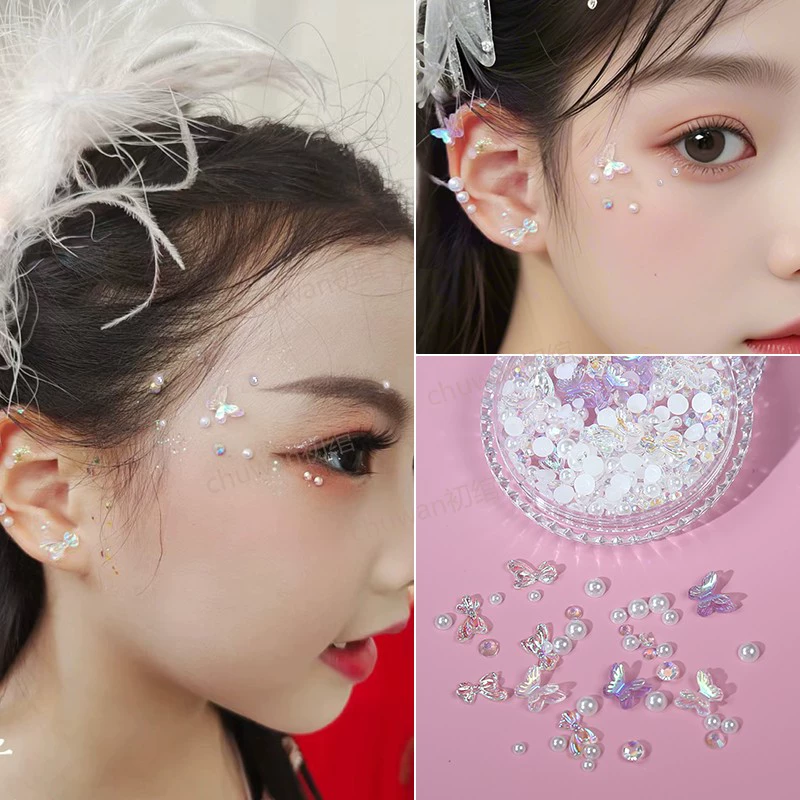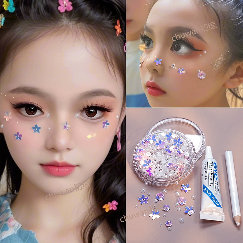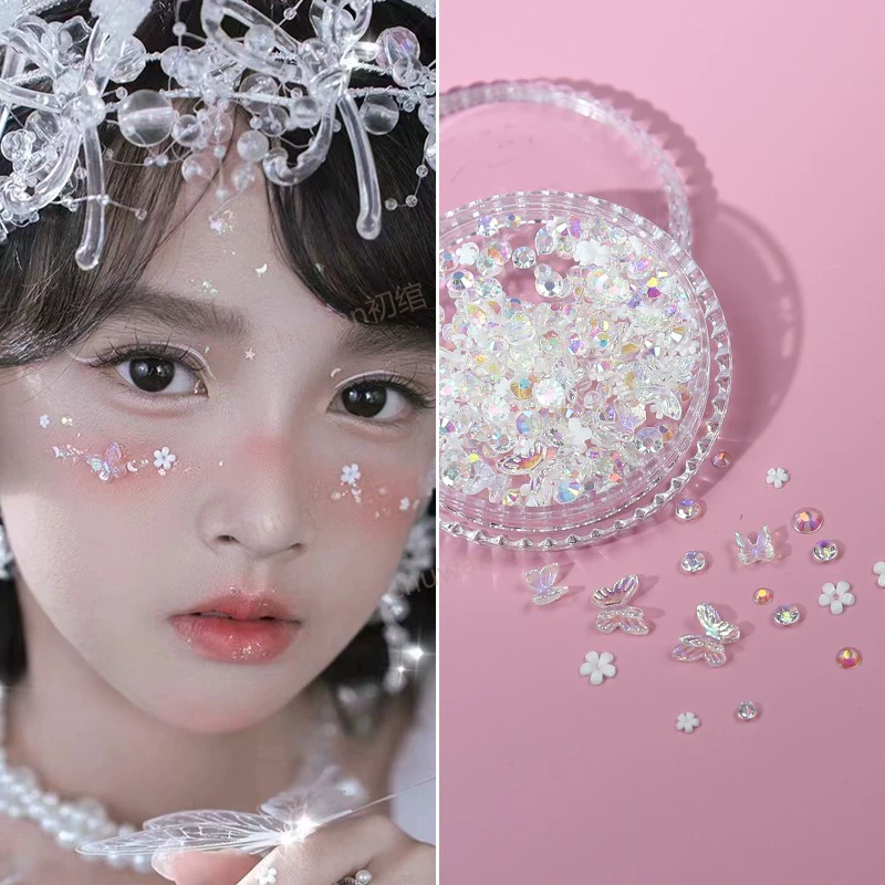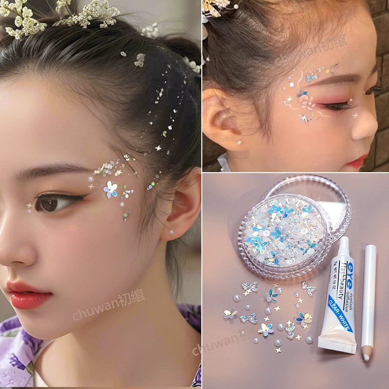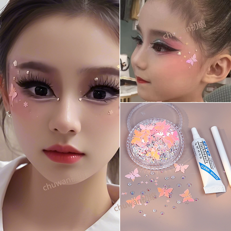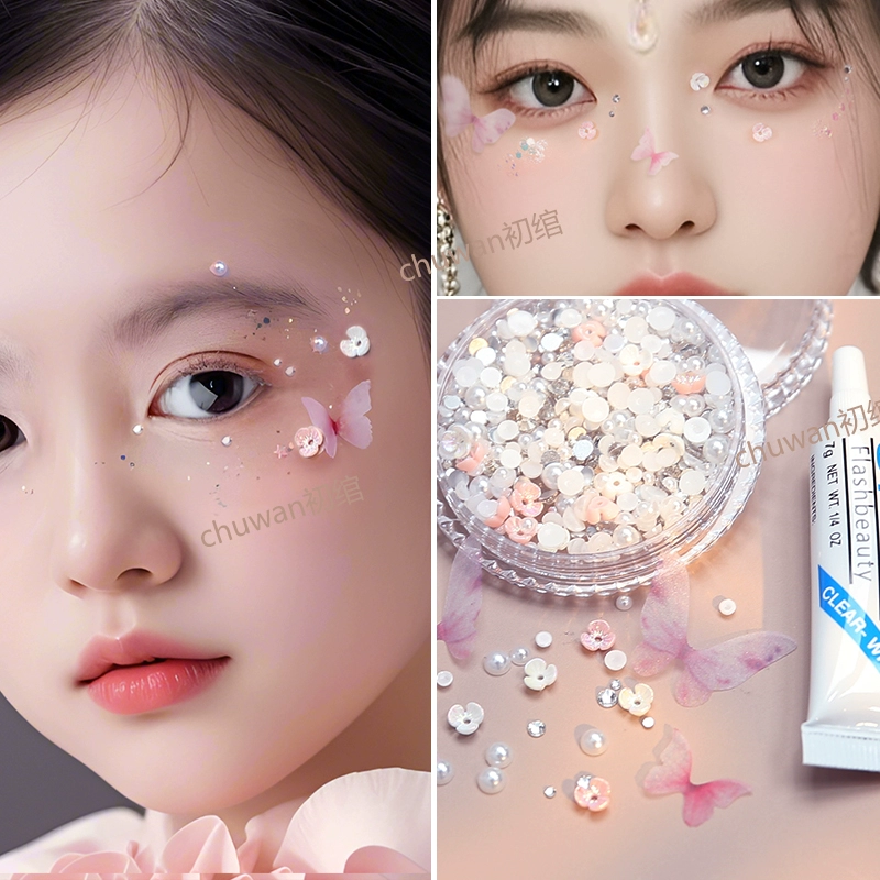 | nameOriginal | Jewelry on face, bright diamonds, eye makeup for stage performance |