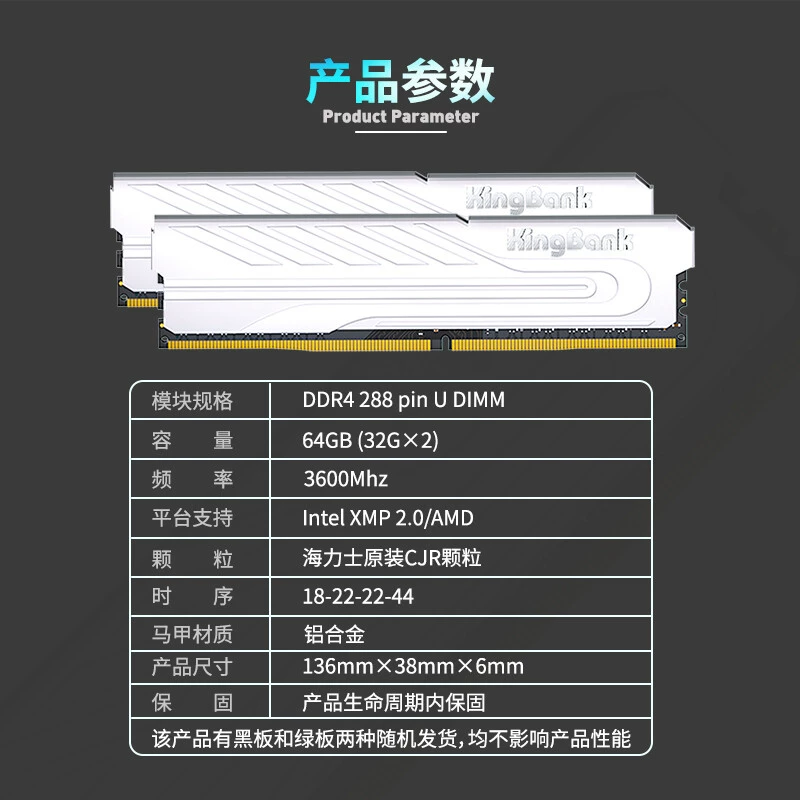 | nameOriginal | Jinbaida 64GB (32G×2) D4 3200/3600Hz desktop memory Silver Hynix Samsung particles |