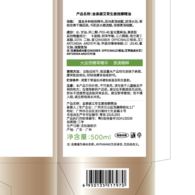 | nameOriginal | Jintaikang massage essential oil beauty salon massage scraping essence oil relieving pressure and activating collaterals ginger wormwood essential oil |