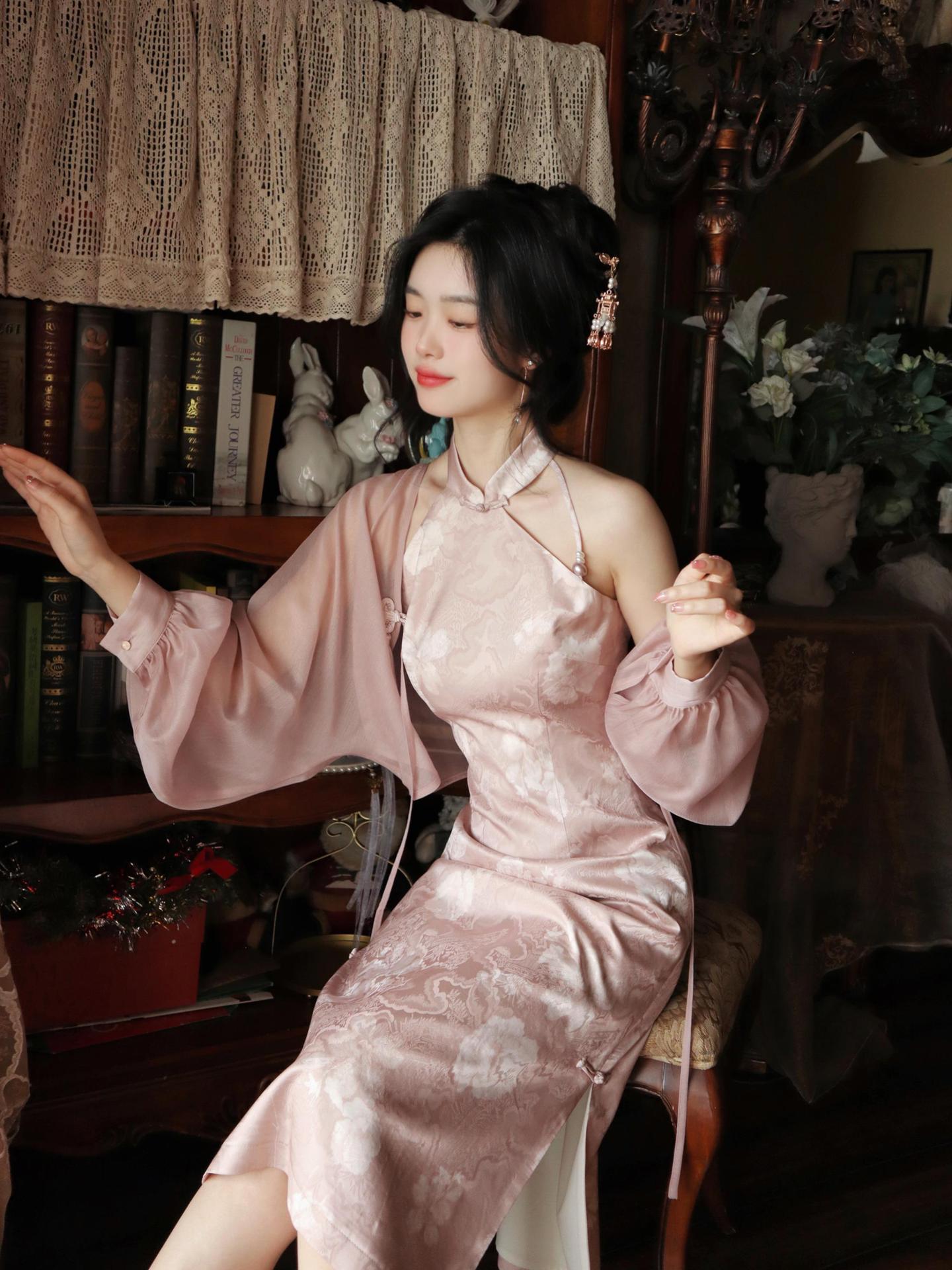 Jinyun flower New Chinese cheongsam National style mercerized satin surface sling dress Women's Spring New