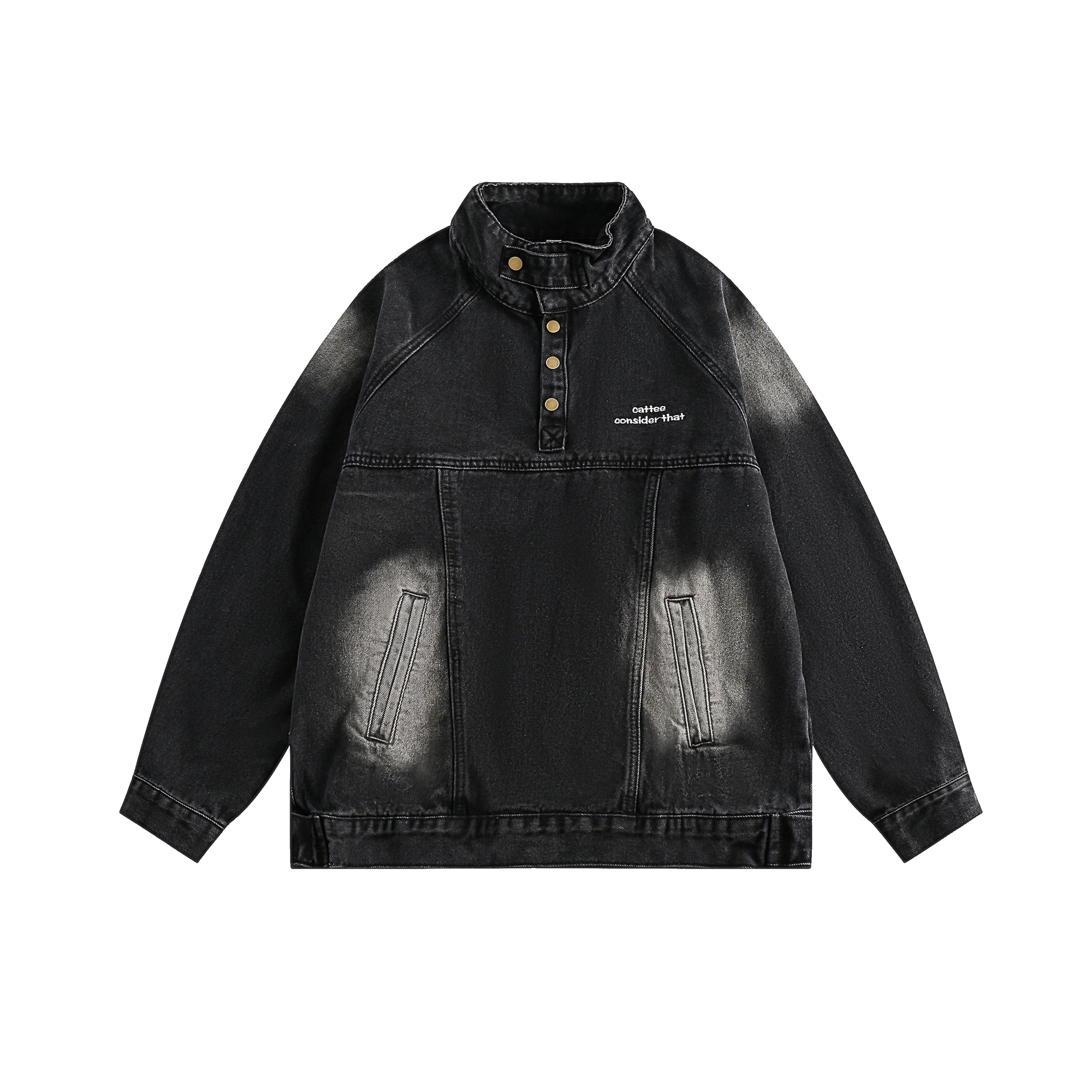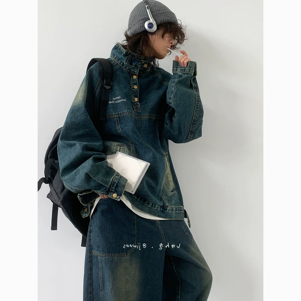 Jiwuus Spring and Autumn Festival is a retro street semi -high collar as old denim jackets men and women casual loose workpiece jackets