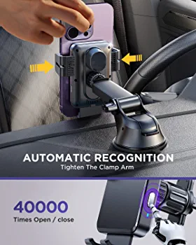 The mount arms and clamps are equipped with silicone pads that are slip and shock resistant, ensuring that your phone stays securely in place even on bumpy roads. The product also has a built-in super capacitor that allows you to touch the release buttons of the car mount charger 2-3 times to clamp or release your phone, even if the car is shut off.