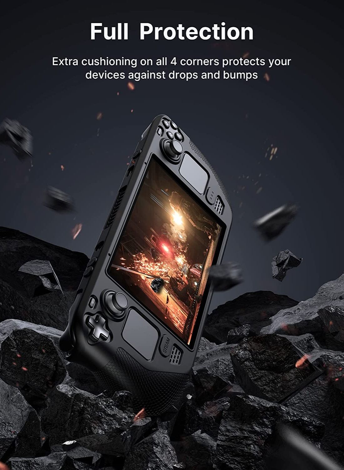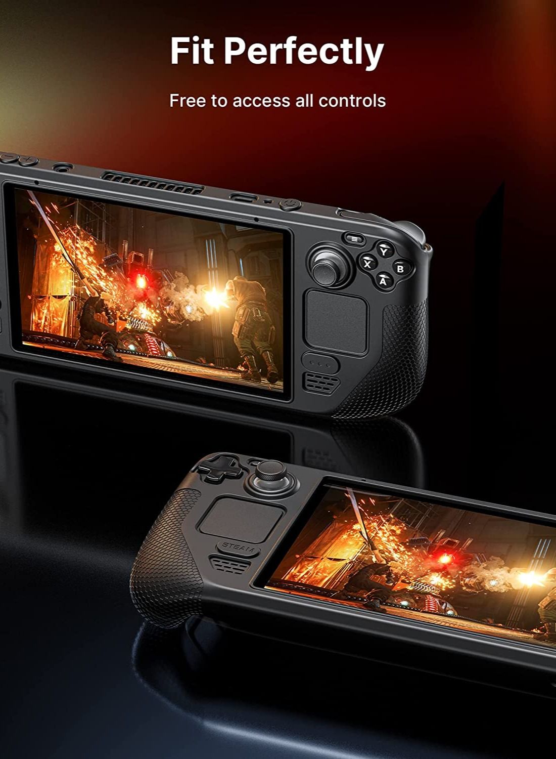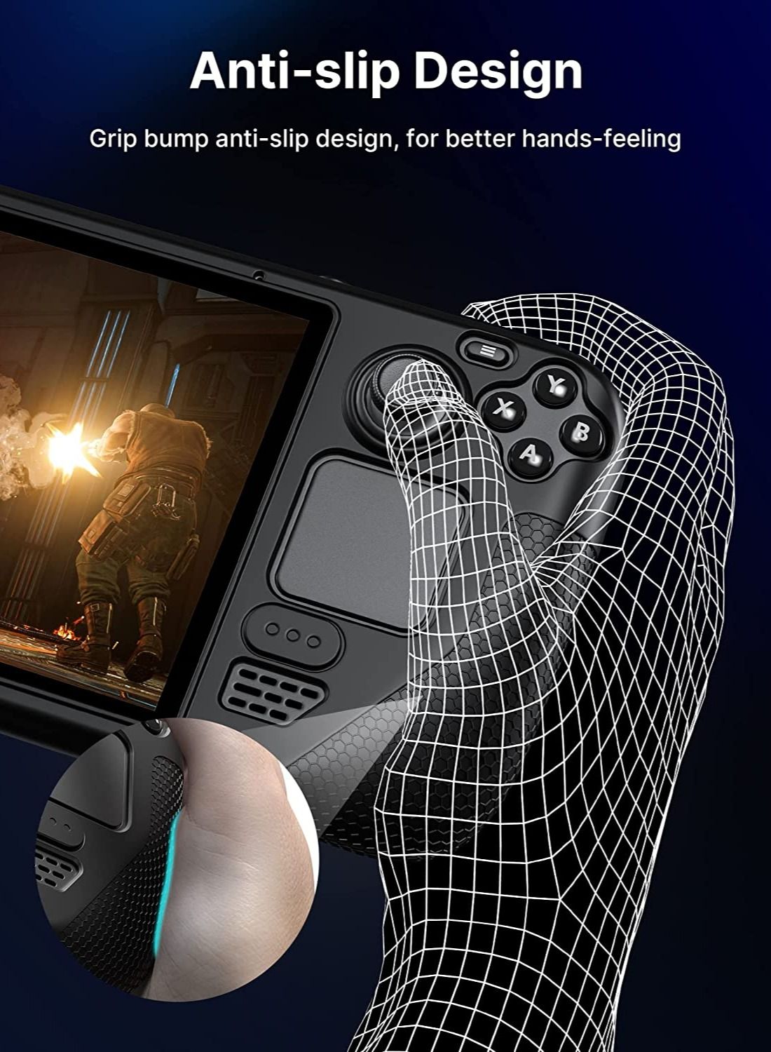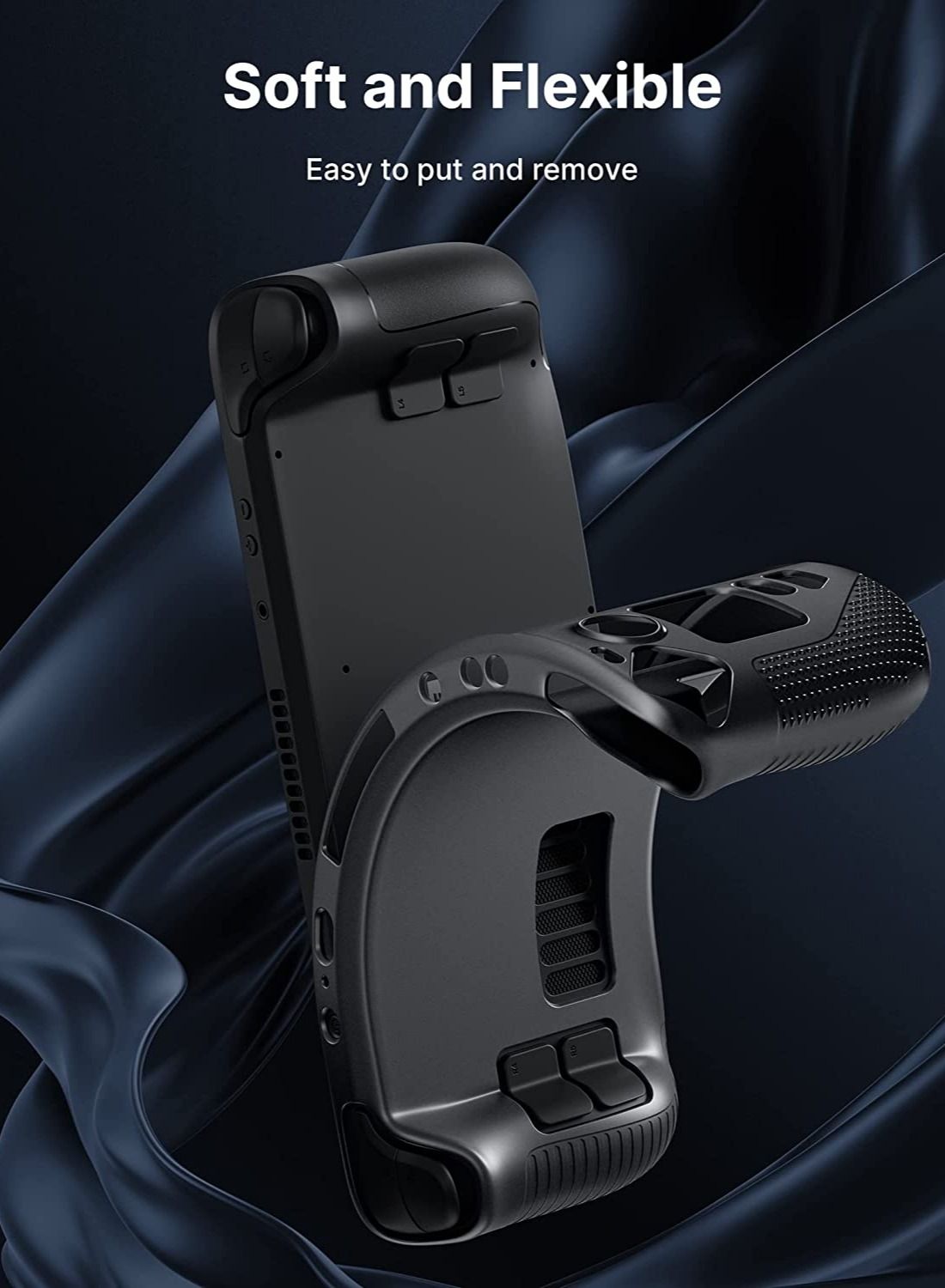The ergonomic design of this Steam Deck case makes it comfortable to hold for extended gaming sessions. The non-slip bump design on both sides provides a better grip. The soft and flexible material makes it easy to put on and take off, and it is lightweight, portable, washable, and reusable.