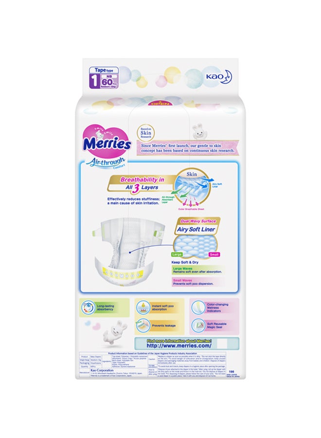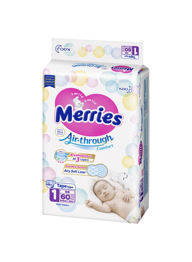 Introducing the Air Through Comfort Baby Diapers Tape Jumbo Pack, specially designed to provide ultimate comfort and protection for your little one. These diapers are perfect for newborns weighing up to 5kg and come in a jumbo pack of 60 diapers, ensuring that you always have a fresh diaper on hand.