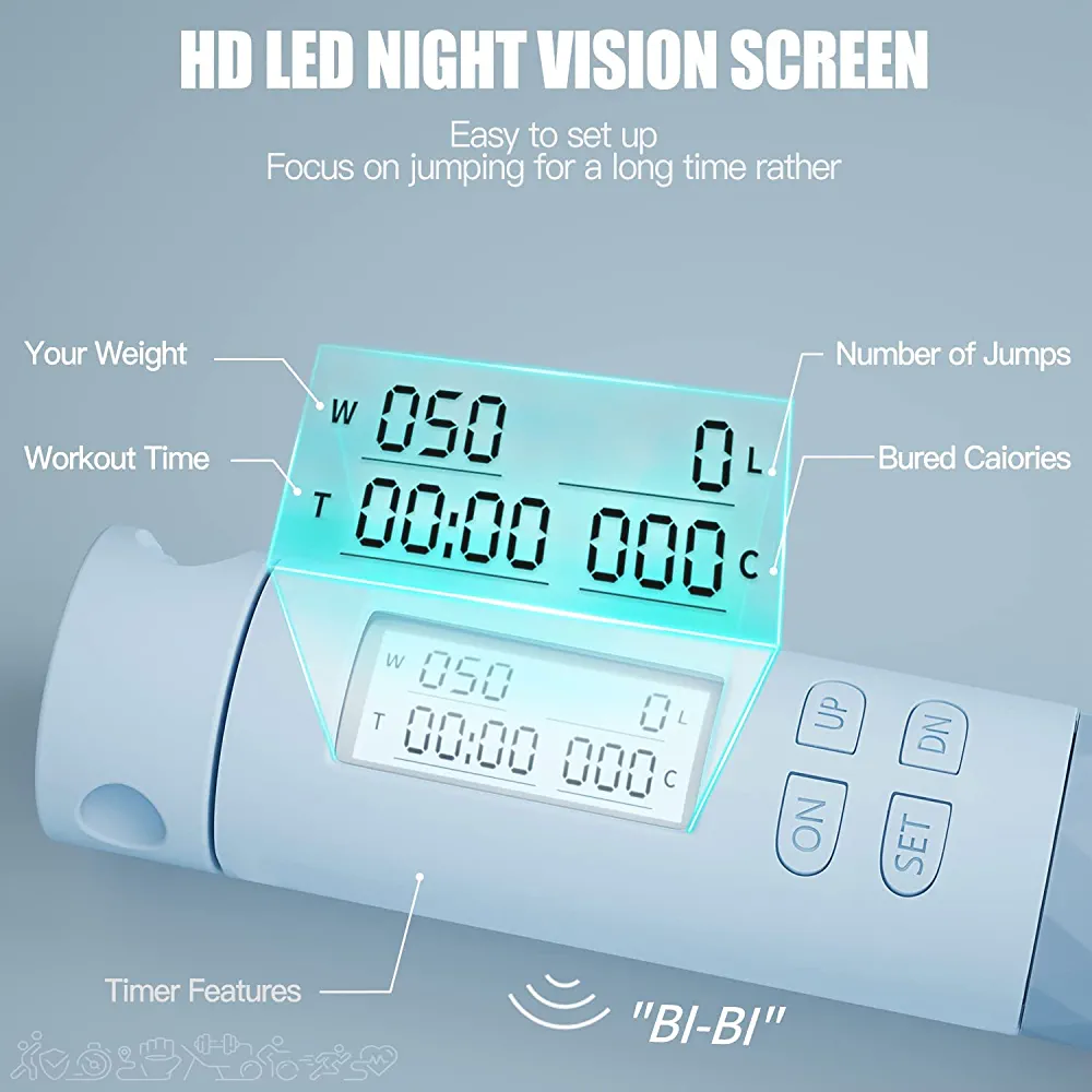 This skipping rope comes with a Backlit HD LED display that shows important fitness metrics such as Timer, Weight, Calorie, and Circles. By tracking the number of circles you jump and calculating the current calorie consumption based on your weight, this rope can help you achieve better fitness results.