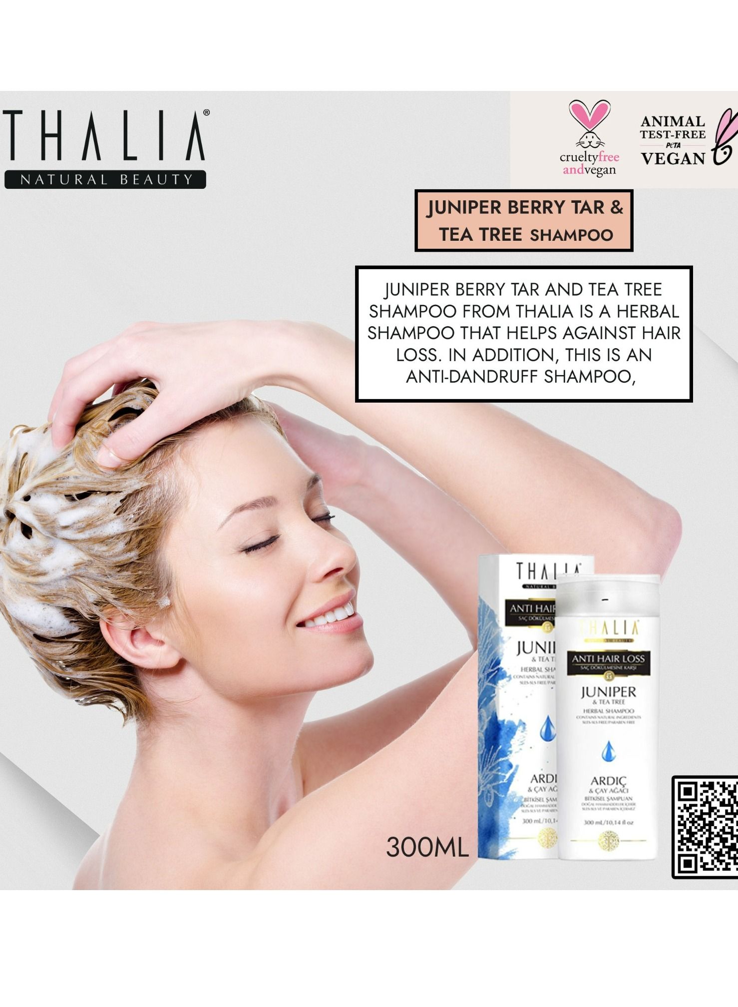 Introducing the THALIA Juniper Berry Tar & Tea Tree Shampoo, a premium hair care product that is specially formulated to provide a deep cleansing and nourishing experience for your hair and scalp. This 300 ml bottle of shampoo is infused with the goodness of juniper berry tar and tea tree oil, which work together to effectively remove impurities, excess oil, and product buildup from your hair and scalp, leaving them feeling refreshed and revitalized.