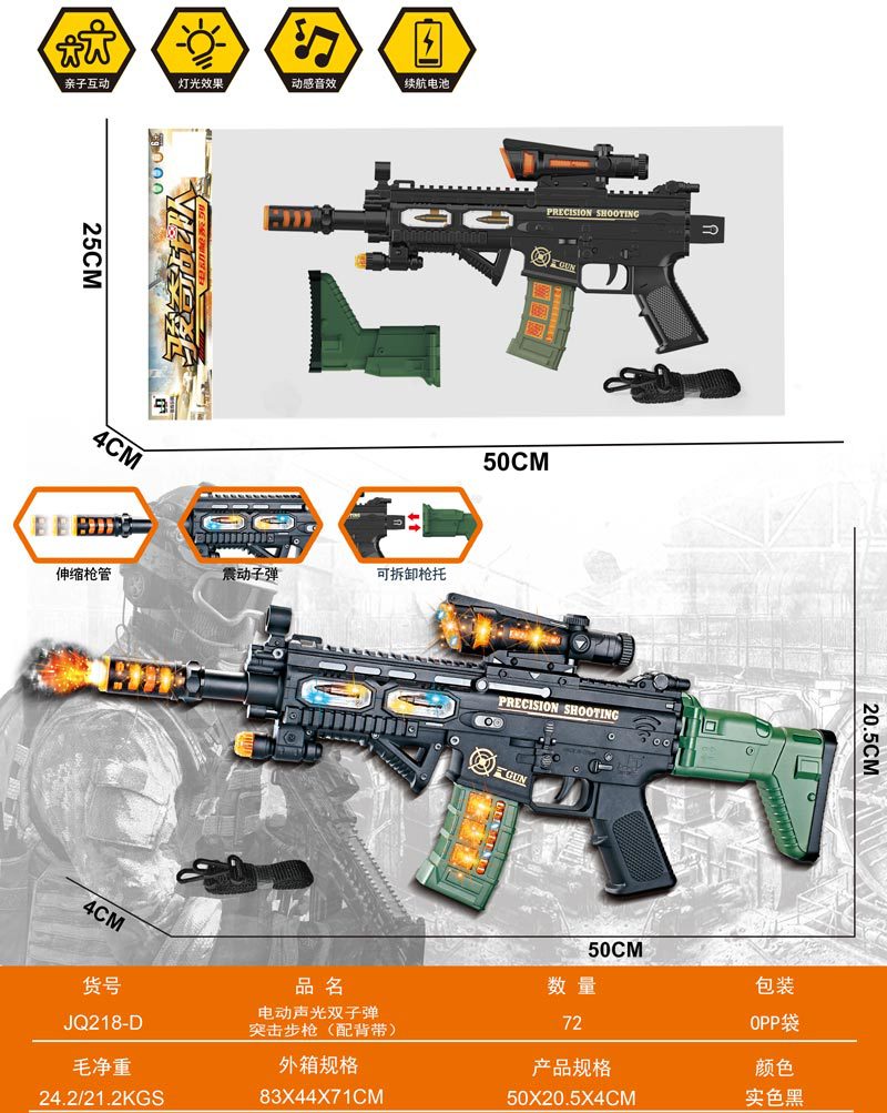 | nameOriginal | Junqi play house lighting sound effect electric voice gun parent-child interactive shooting vibration telescopic barrel eight-tone gun |