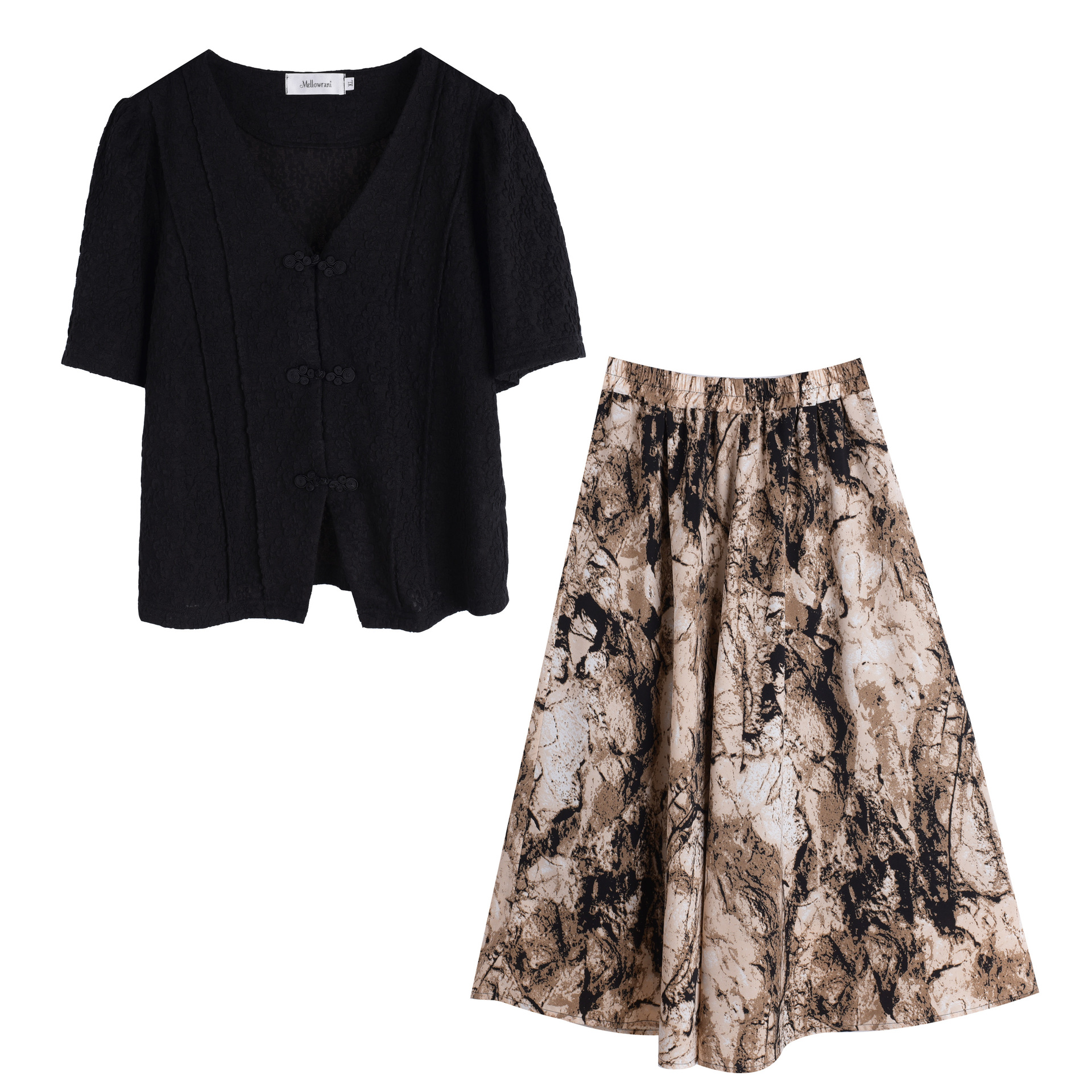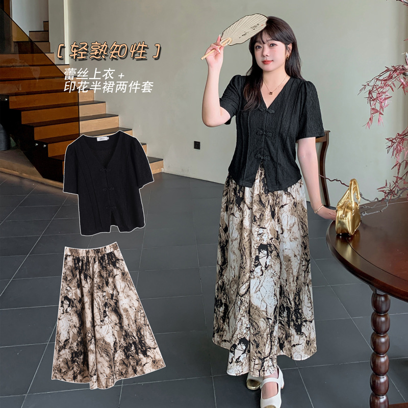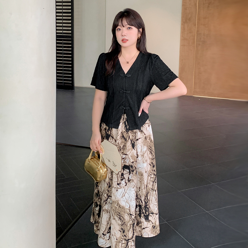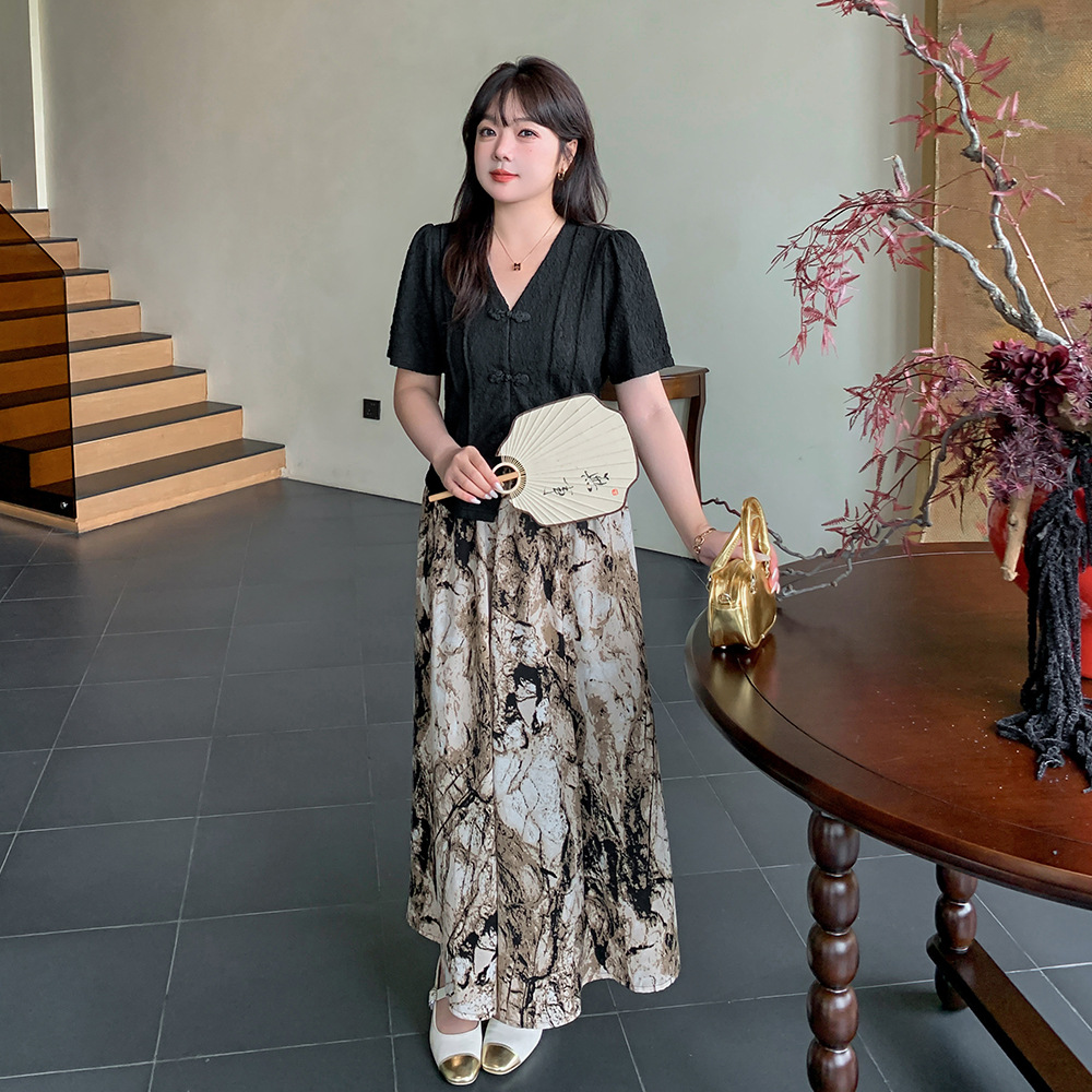 K2775 Summer plus size Women’s Clothing National Style V-Neck Shoulder Shirt Floral Long Skirt for Chubby Sister suit