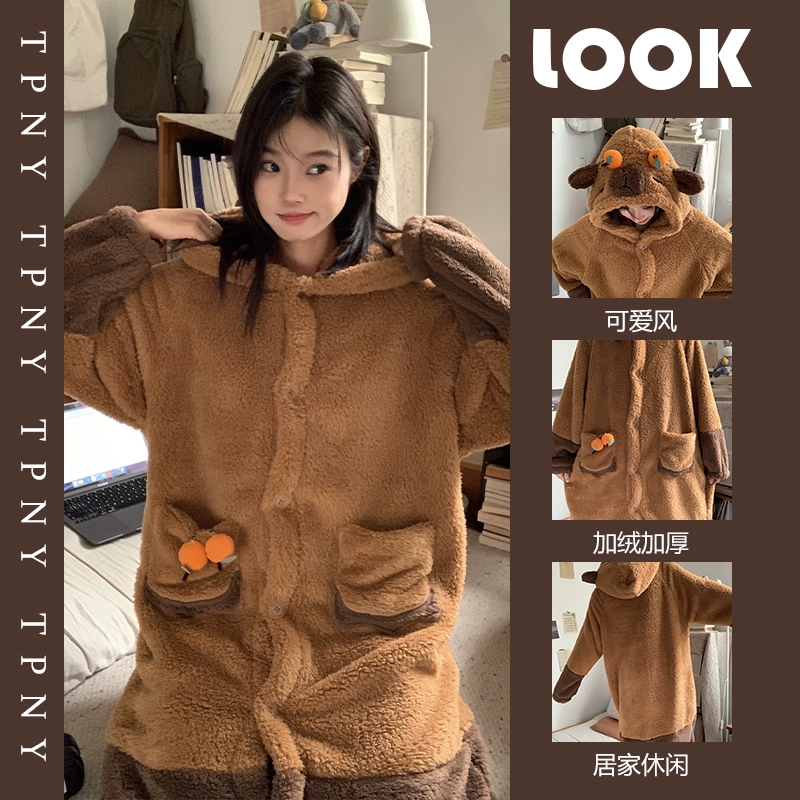 Kapibala Capybara coral velvet pajamas for women winter 2024 new cute plus velvet thickened plush nightgown nightgown