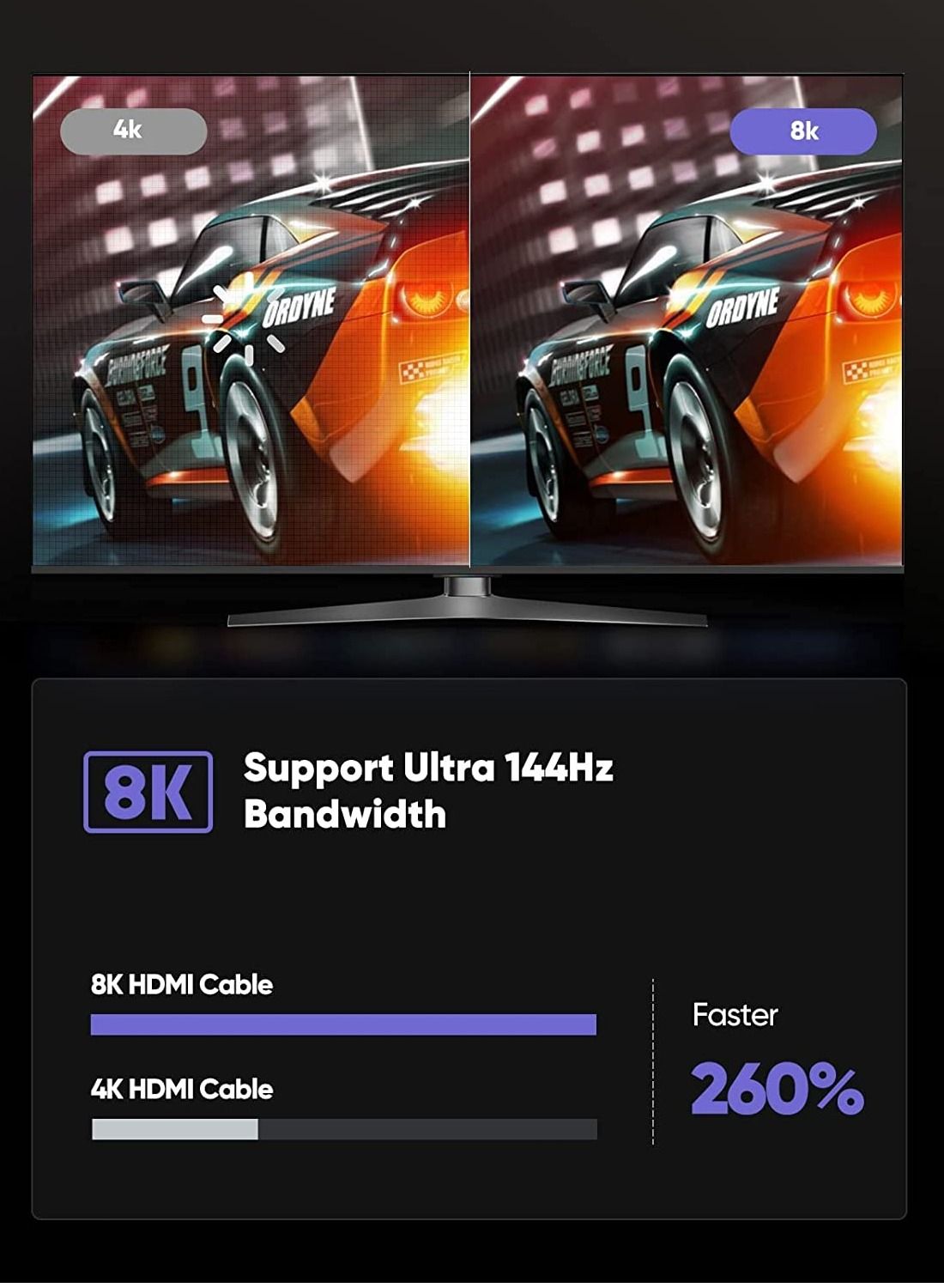 KASTWAVE 8K HDMI Cable 2.1, 3.3FT/1M long, supports 4K@120Hz Dynamic HDR/HDCP 2.2/3D and is compatible with MacBook Pro, PS5, TV, Xbox One, and Switch.