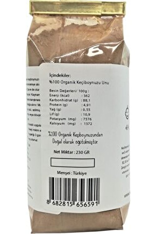 +8 Months. Gluten free. Drug-free, GMO-free, no additives, pesticide-free and completely organic carob flour that we produce with organic agriculture that can be added to baby supplement foods. Organic carob flour is produced in accordance with the Organic Agriculture Law No. 5262 of the Republic of Turkey, the regulations on the principles and implementation of relevant organic agriculture. TR-OT-42 authorised by the Ministry of Agriculture and Forestry, Met Ecological Control Certification LTD. It is certified and checked by STI. Storage Condition:Protect from the sun.Keep cool, damp-free, free from foreign odors and tastes. Nutritional Values: Energy (kcal): 362 Carbohydrate (g): 88.1 Protein (g): 4,91 Fat (g): 0,55 Fiber (g): 10,9 Potassium (mg): 7576 Calcium (mg): 1372 Organic carob flour makes a great breakfast product especially when mixed with honey, molasses and tahini and consumed. As an alternative to cocoa milk that you will prepare for your children, milk with organic carob flour and honey is our recommendation. It is possible to make many foods or drinks with carob flour. Important Reminder: Pregnant and lactating individuals should use it strictly in consultation with a doctor. Notice:The articles are for general informational purposes only, please contact your doctor for diagnosis and treatment.