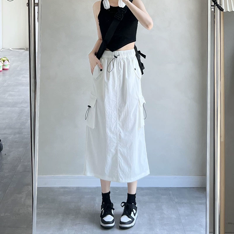 Khaki American Retro Workwear Skirt Women's Summer Small Slit Mid-Length A-Line Skirt Drawstring Long Skirt