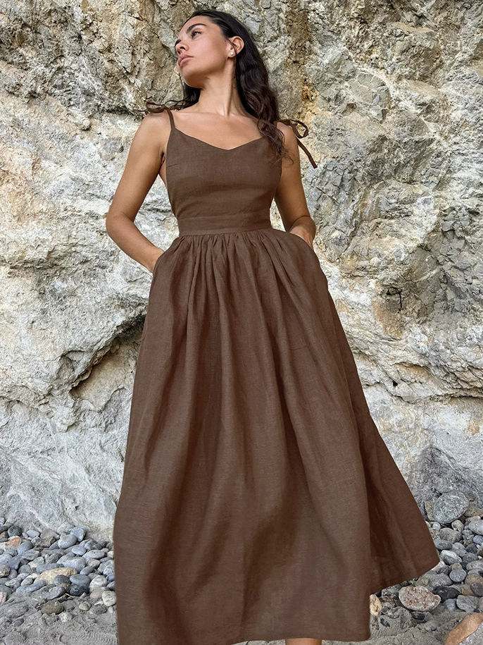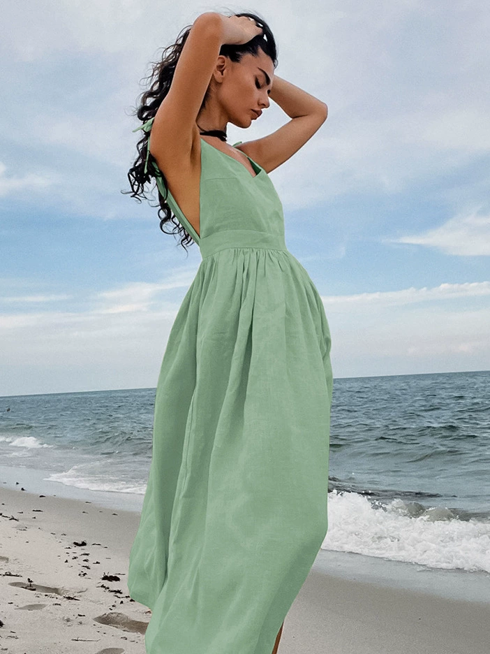 | nameOriginal | Khaki cotton and linen backless dress with resort style suspenders |