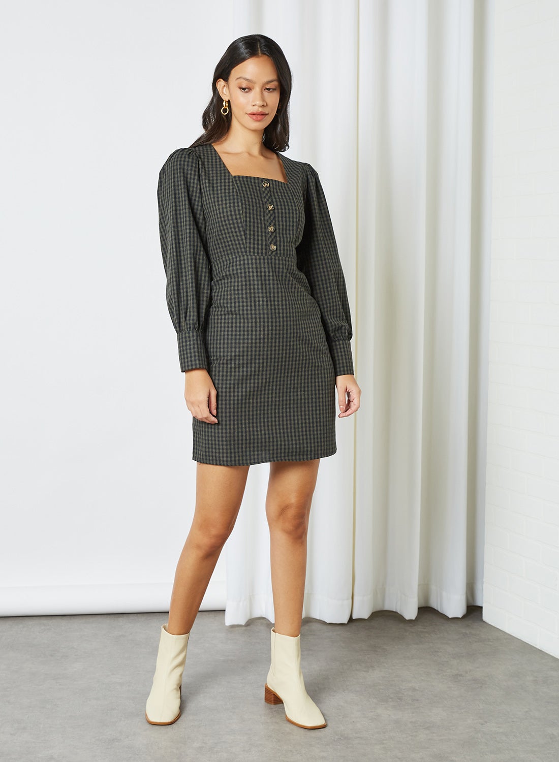 Achieve a chic appearance by pairing this dress with boots. It features a square neckline and long sleeves, with an all-over checked pattern that adds a touch of sophistication. The front button detail and concealed back zipper closure provide a secure fit, while the mini length adds a flirty touch. Made from 65% cotton and 25% polyester, this dress is easy to care for by following the instructions on the care label. The model is 178cm tall and wears a size 34.