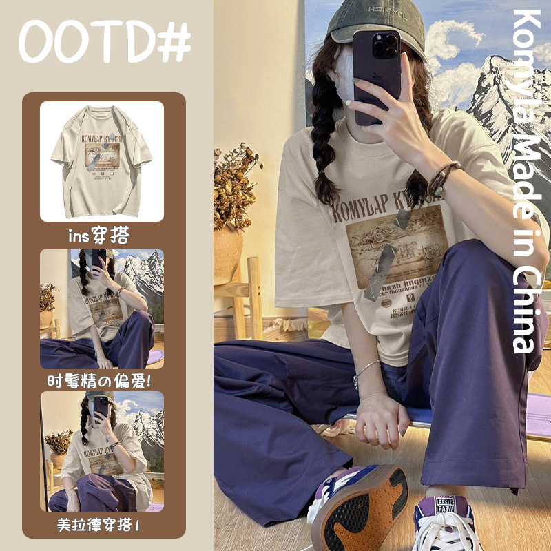 | nameOriginal | Khaki% heavy pure cotton Maillard wear oversize fashion brand printed short-sleeved T-shirt women's top I summer |