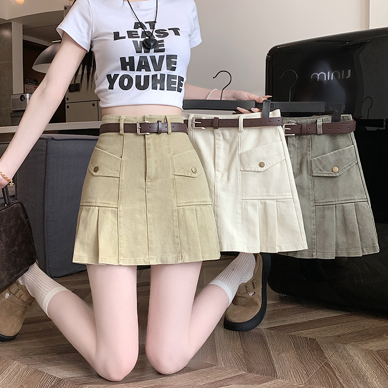 khaki Tooling Pleated Skirt Women's Summer 2024 New High Waist Slimming Sweet Spice Girl Small Puff Skirt