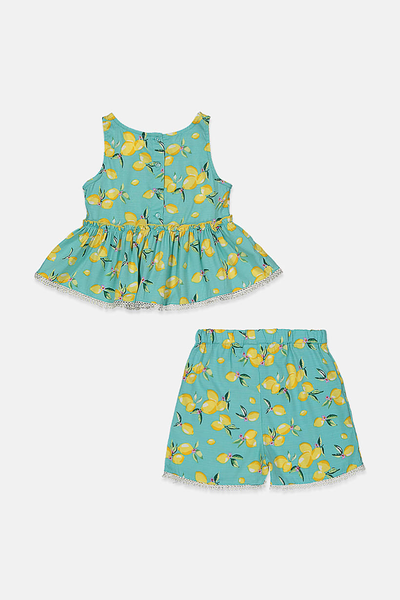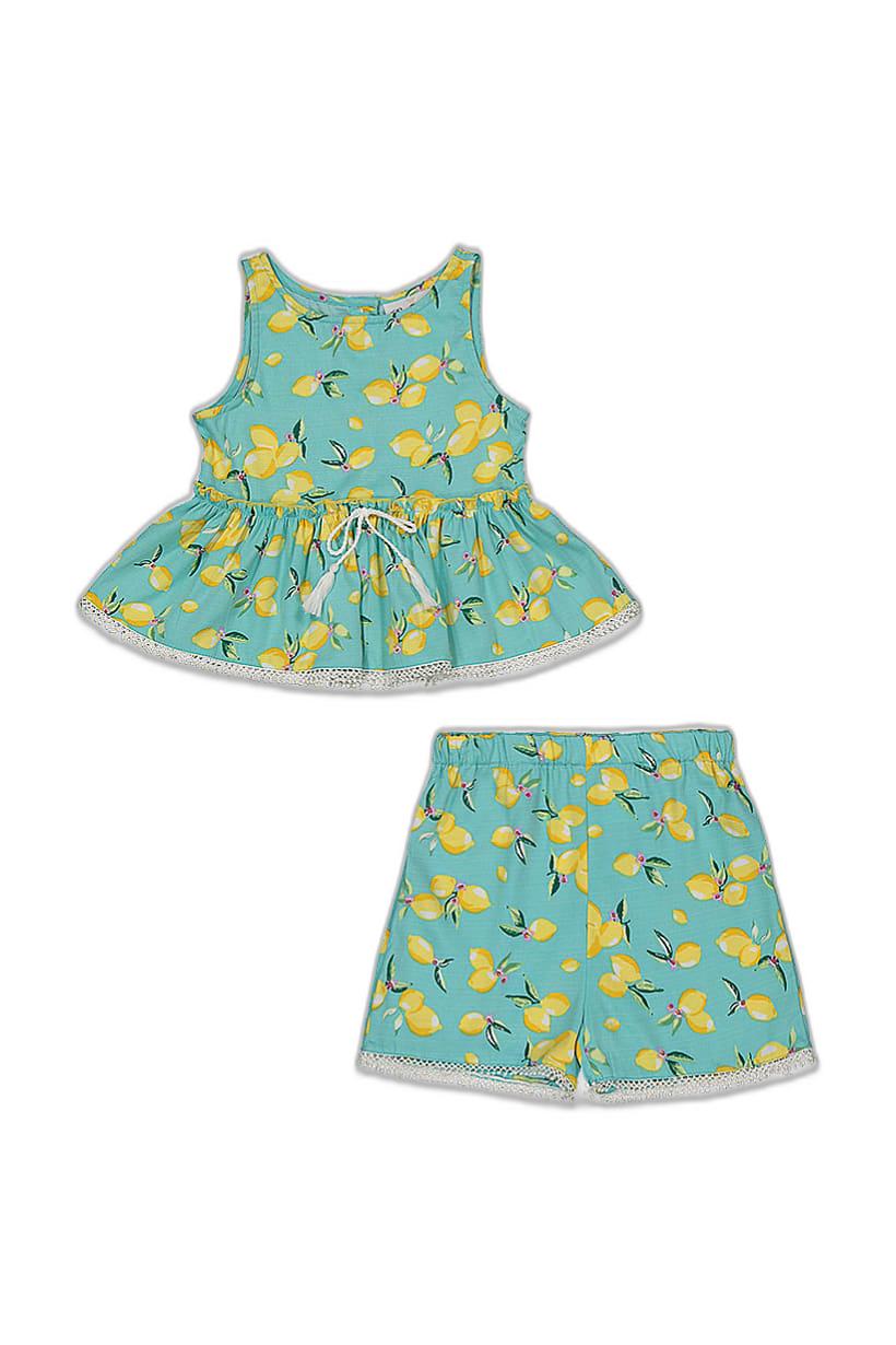 | sub_Categories | Girls Fashion, Girls Tops & Tees, kids girl 2piece allover print ruffle hem top and short set turquoise |
