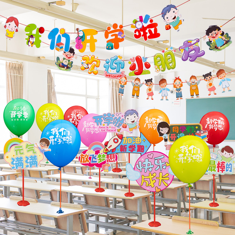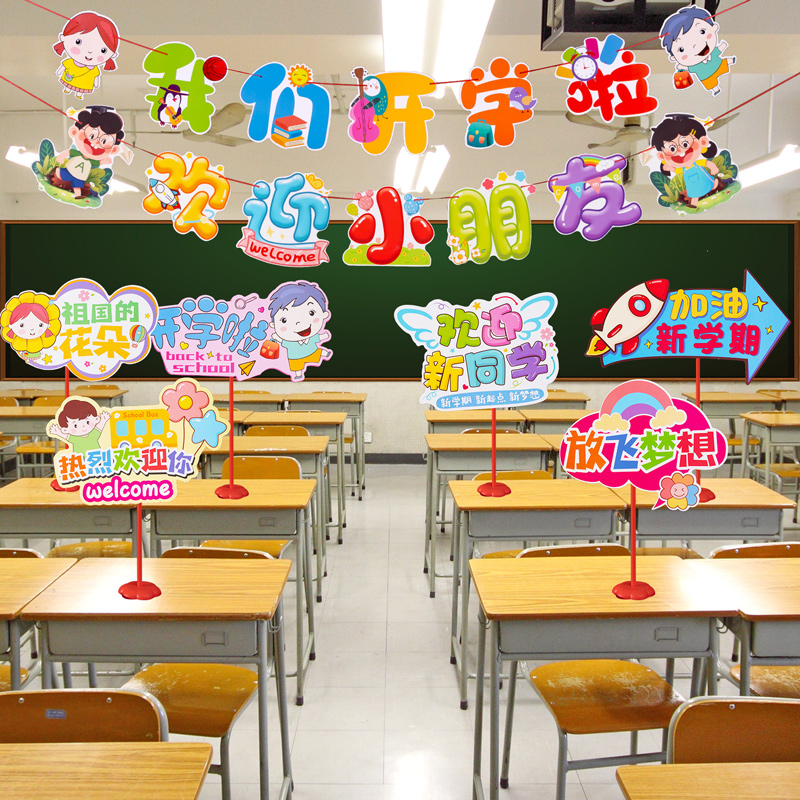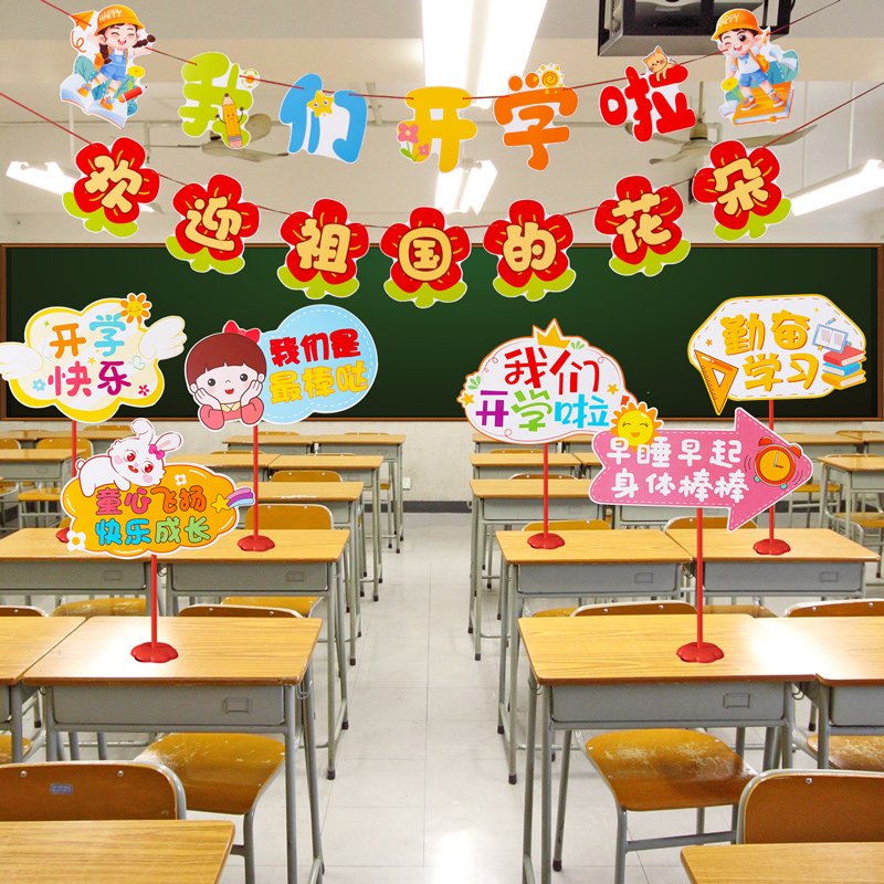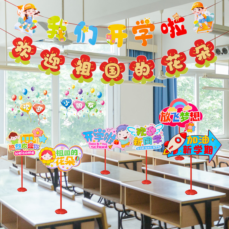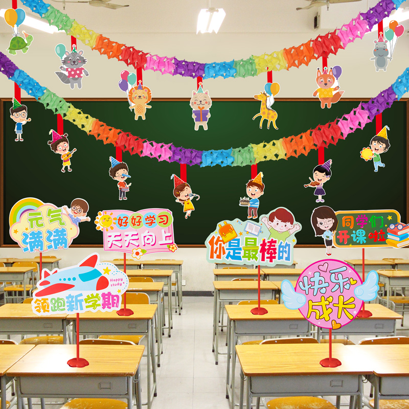 Kindergarten primary school opening ceremony feeling ring creation activity class classroom layout pendant table floating decoration flag hanging decoration