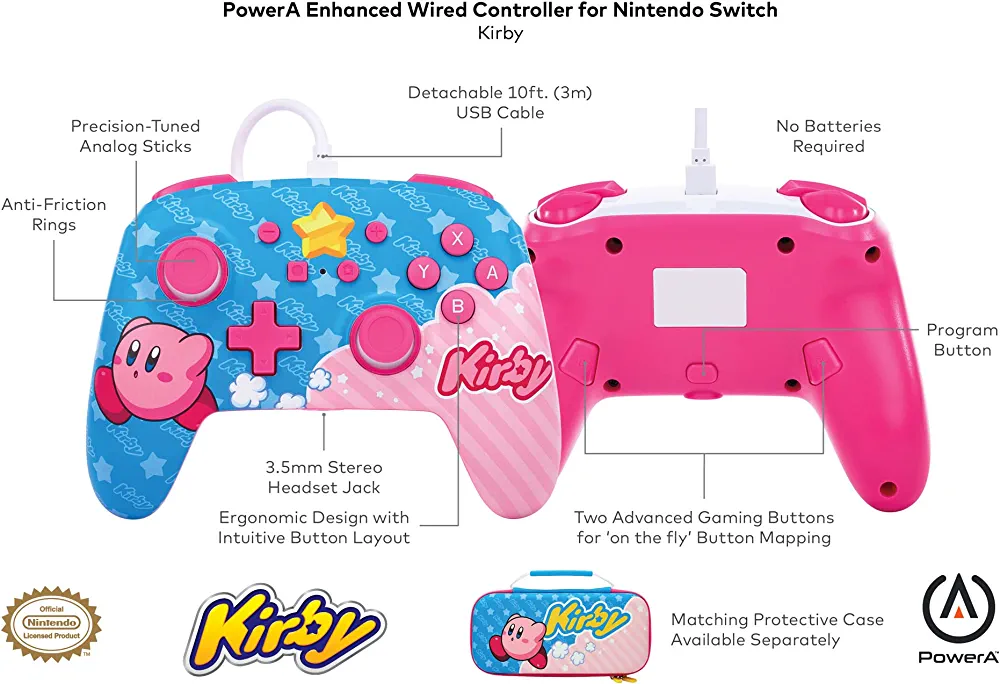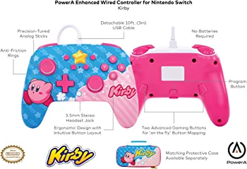 | descriptionOriginal | PowerA Enhanced Wired Controller for Nintendo Switch – Kirby Officially licensed by Nintendo, the PowerA Enhanced Wired Controller for Nintendo Switch combines beauty and performance. Each controller includes world-class art, along with awesome gaming features. Program two mappable Advanced Gaming Buttons on-the-fly, plug in your headset for stereo sound, and enjoy smooth thumbstick control thanks to a pair of embedded anti-friction rings. Includes a 10ft (3m) USB cable, plus PowerA backs all products for 2-years to reinforce quality commitment. Key Features: Get an edge over the competition with mappable Advanced Gaming Buttons you can program on-the-fly, mid-game—no system settings to configure. *For use only while Switch is docked. Does not support HD rumble, IR, motion controls or amiibo NFC. Not for use with Joy-Con only games. Celebrate the world’s favorite puffball with a powerful Kirby design Feature-Packed The PowerA Enhanced Wired Controller for Nintendo Switch is filled to the brim with the features you need most, including anti-friction rings for smooth thumbstick control, a 3.5mm stereo audio jack and a Screenshot Button. Wired Control No batteries? No problem. The PowerA Enhanced Wired controller for Nintendo Switch includes a 10-foot cable, giving you plenty of space to get to your favorite spot in the room and play for hours. Hours of Gaming Designed and engineered to the highest standards, PowerA deliver performance you can count on for hours of action-packed gaming. Superior Comfort Game for hours with a controller that feels great in your hands, thanks to cutting-edge ergonomics and top-of-the-line materials. PowerA Quality All of our products must meet the high standards that PowerA has always been known to have. From controllers to cases, the PowerA name is synonymous with quality, functionality and durability. Officially Licensed Officially licensed by Nintendo. PowerA products have gone through Nintendo’s rigorous testing and evaluation processes to ensure compatibility with the Nintendo Switch. |