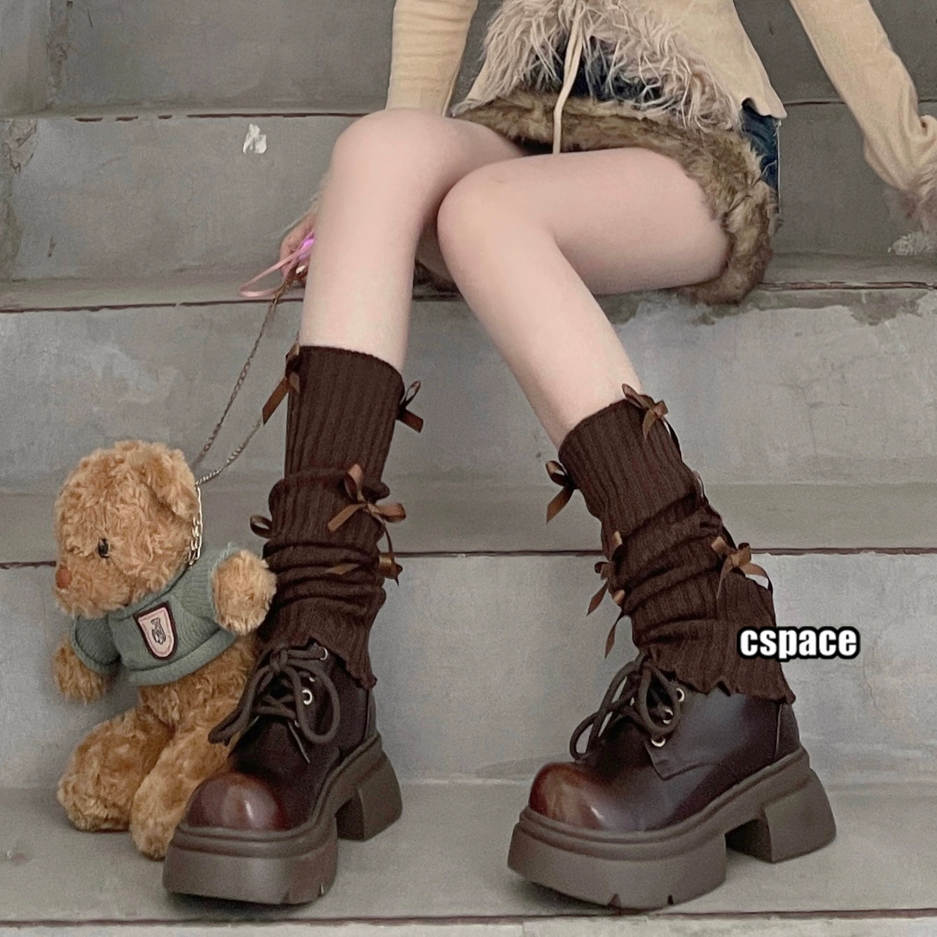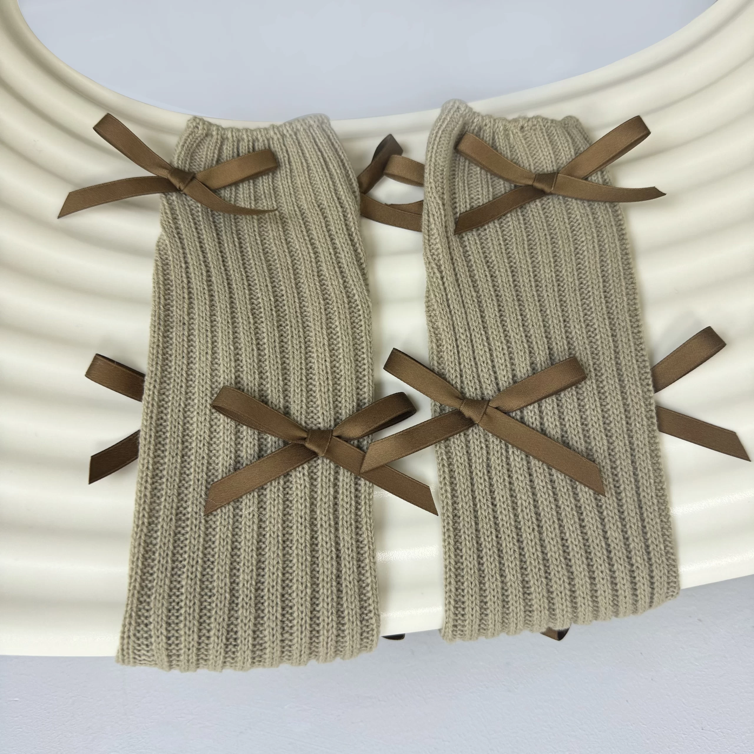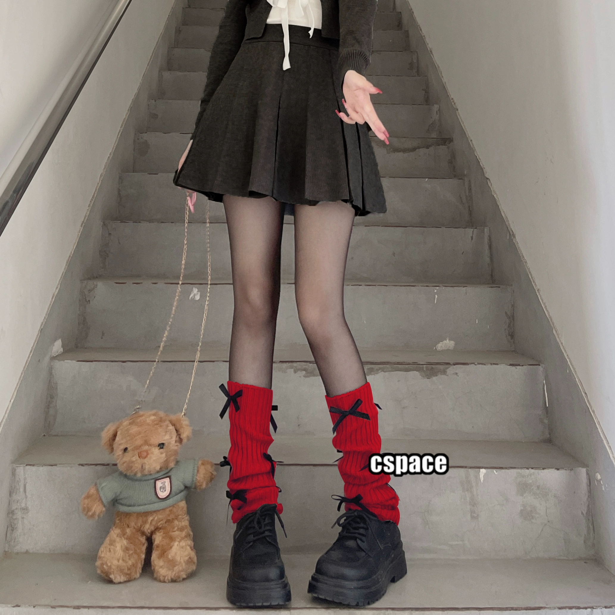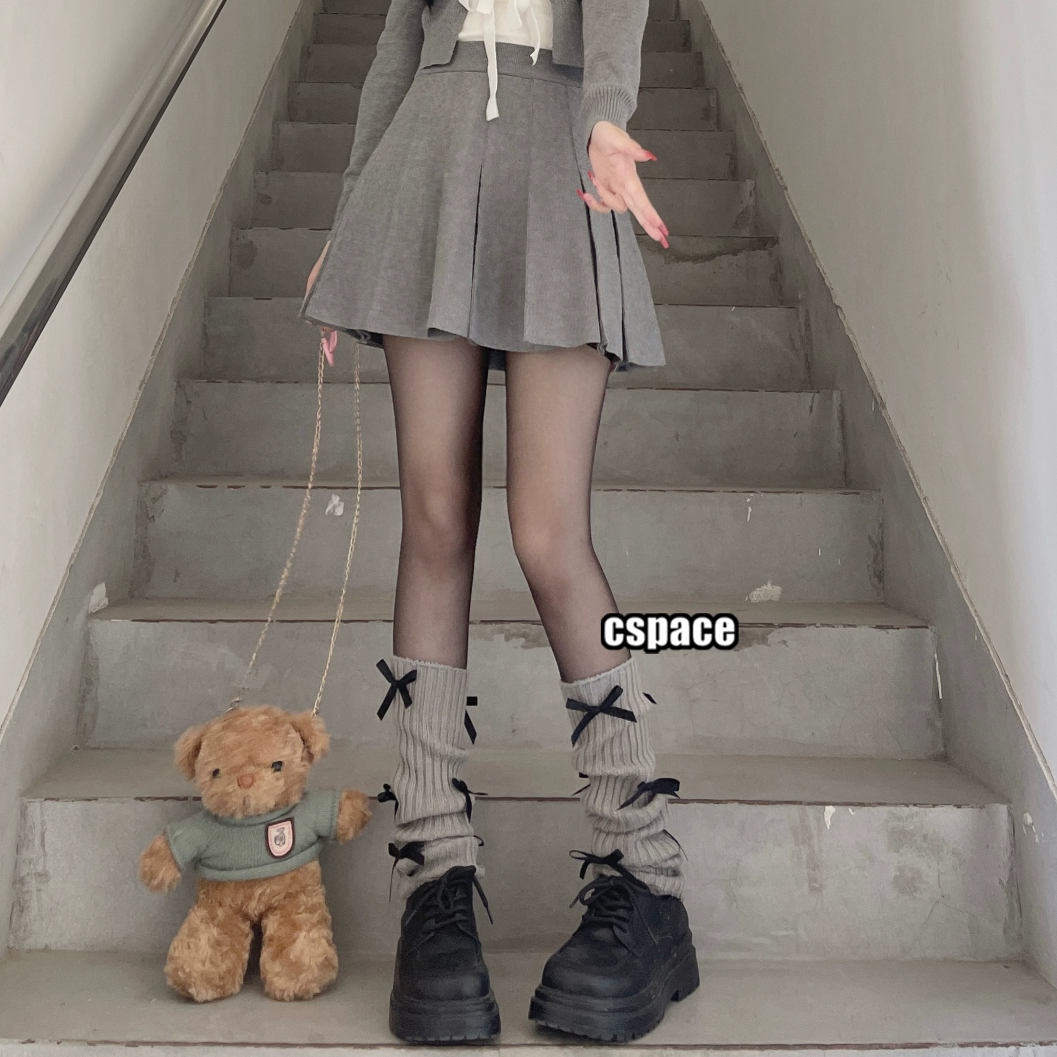 Kirimachi Black Tea Muse ballet style black bow calf sleeves gray knitted black ribbon pile socks