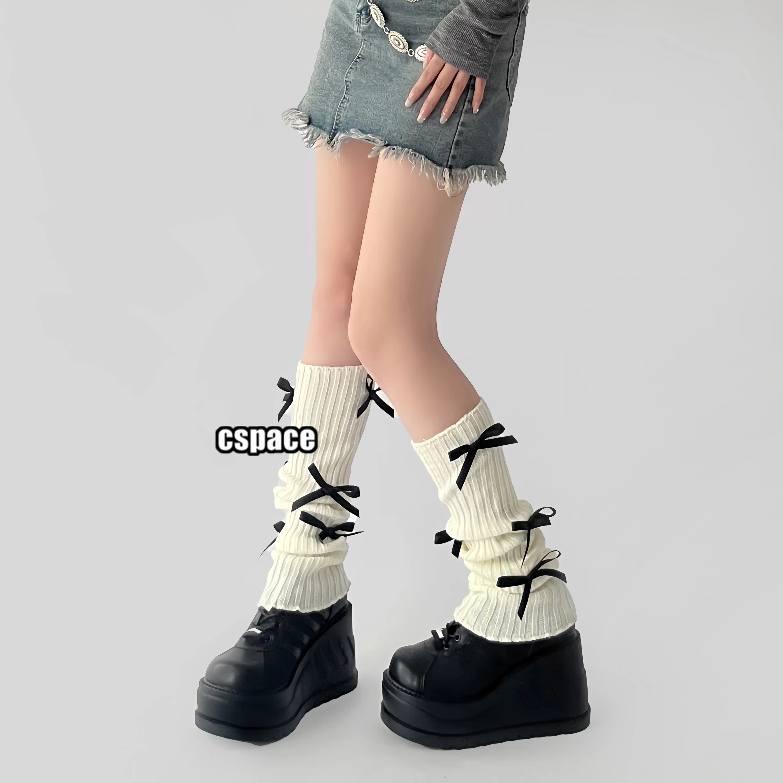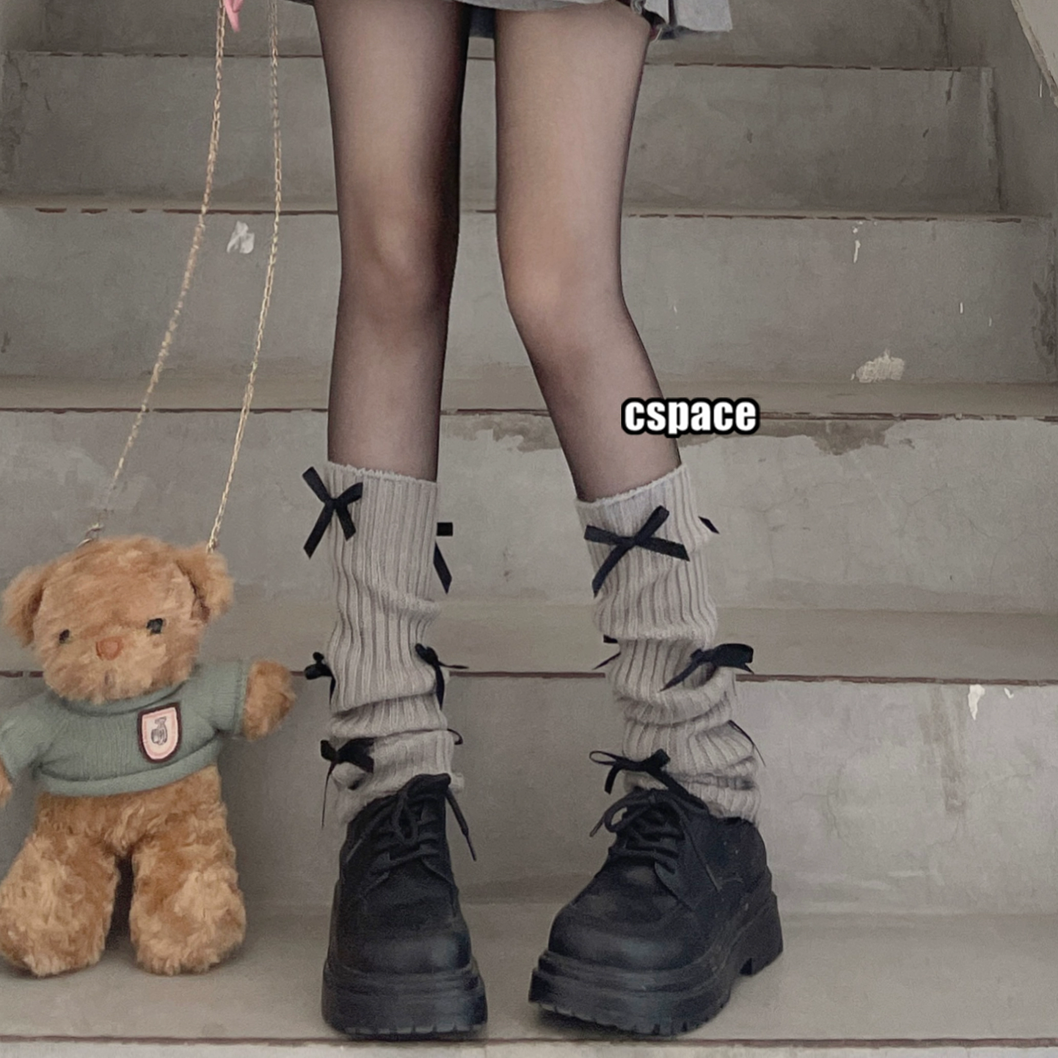 Kiri-cho Black Tea Muse Ballet Style Black Bow Calf Set Grey Knitted Black Ribbon Stack Socks Set